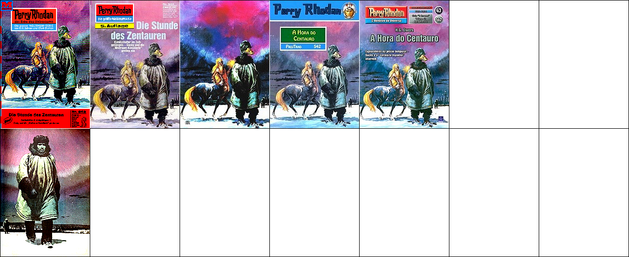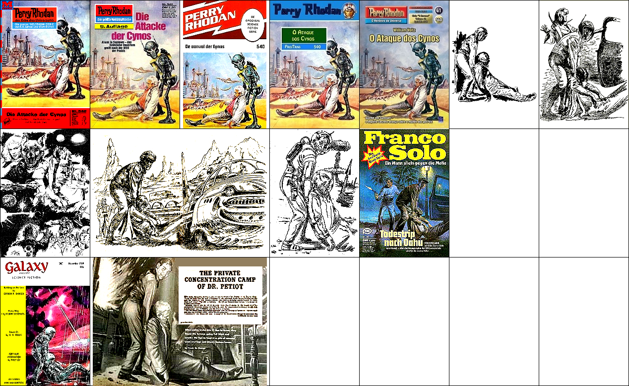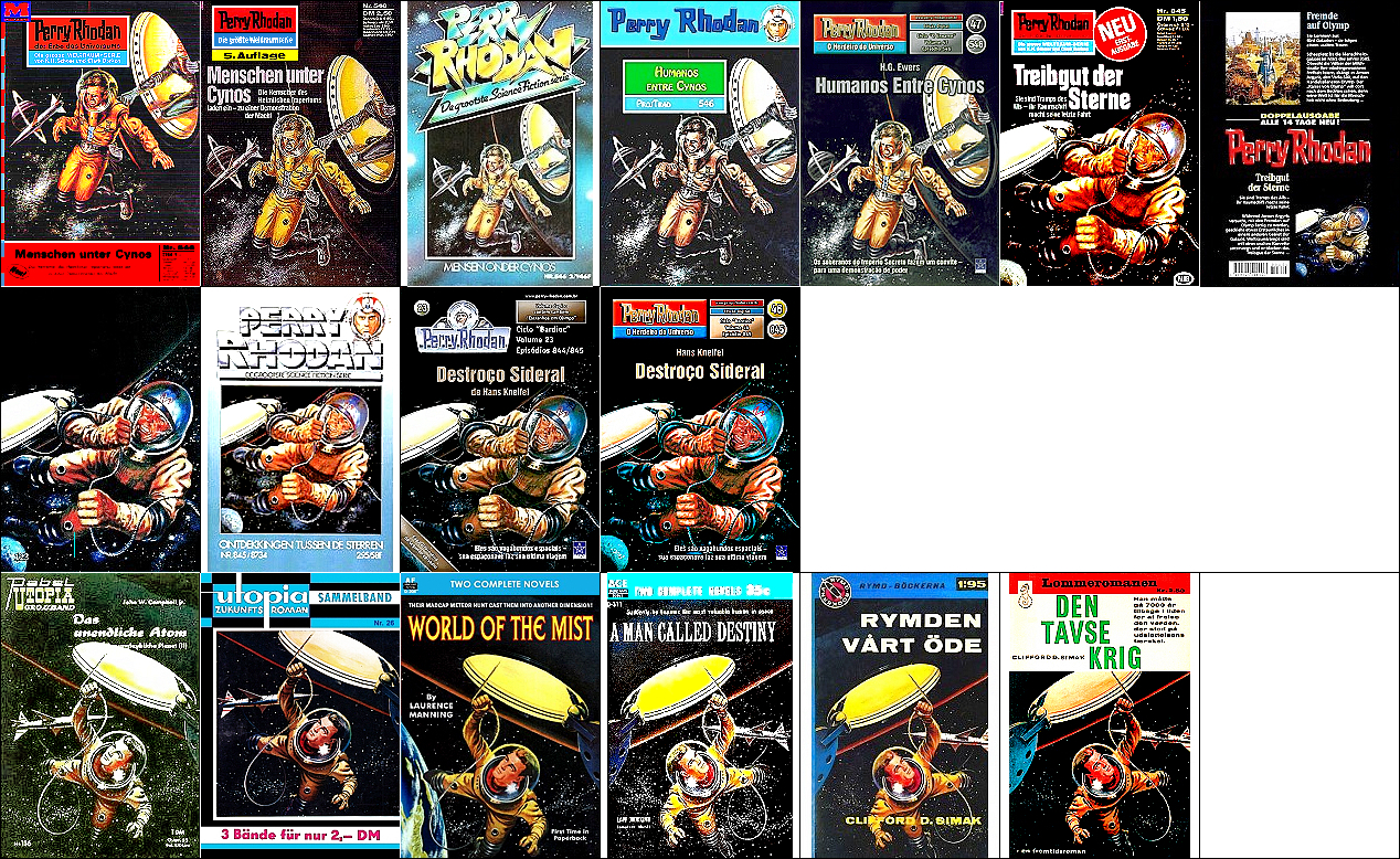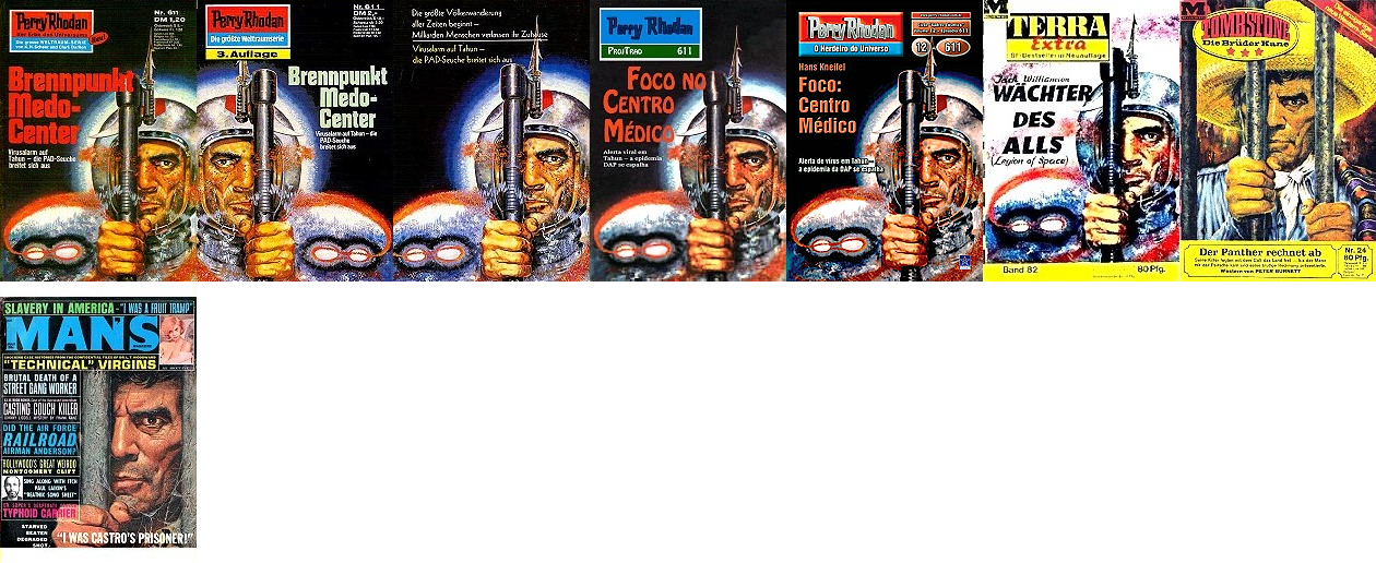 ähnliches Motiv, 1 - 5, 6 - 11, 15 - 20 gleiches Bild, 18 -20 seitenverkehrt, die Valigursky-Bild ist das Vorbild für die Schleuse in 1 und das ganze Bild in 6, wobei der Raumfahrer verändert wurde |