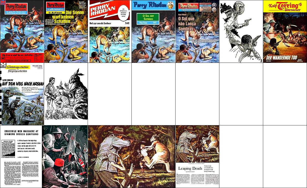 ähnliches Motiv, 1 - 5 gleiches Bild, 6 - 8 gleiche Körperhaltung des Mannes, in 9 findet sich das springende Känguru wieder, 15 wahrscheinlich Vorbild für Nachzeichnung des Mannes, 16 für das obere Känguru |
