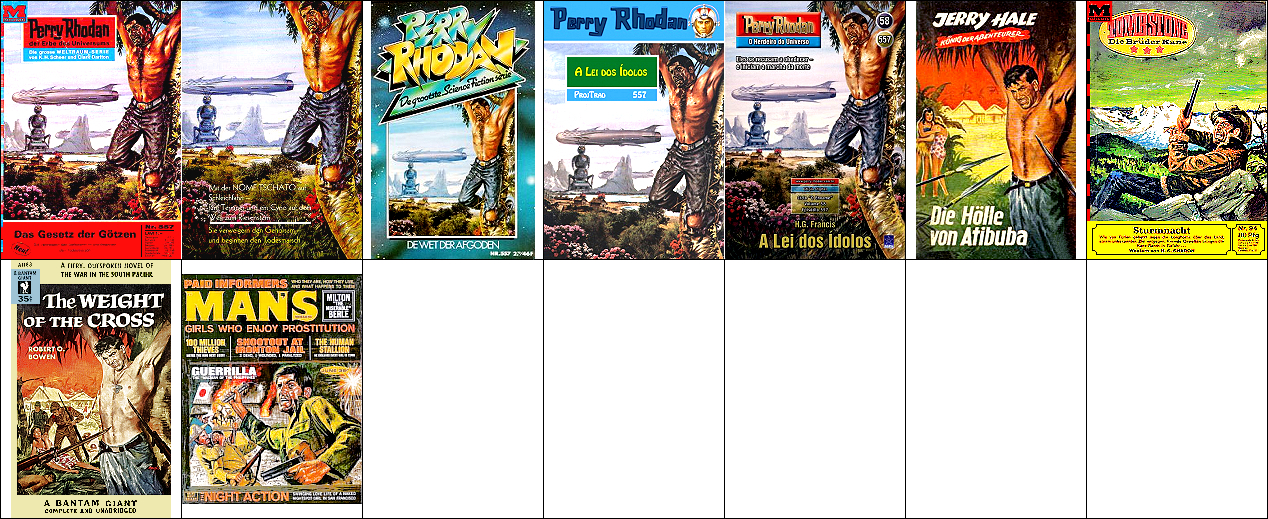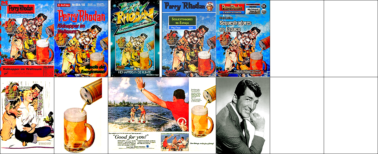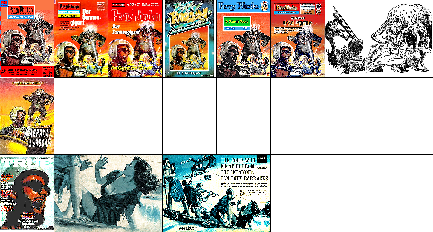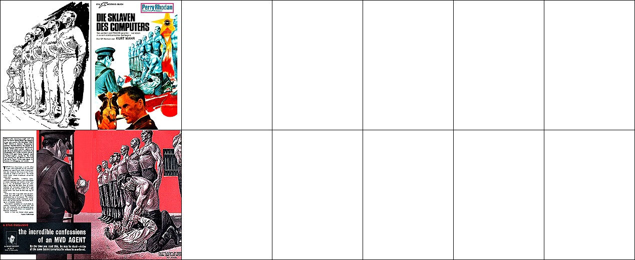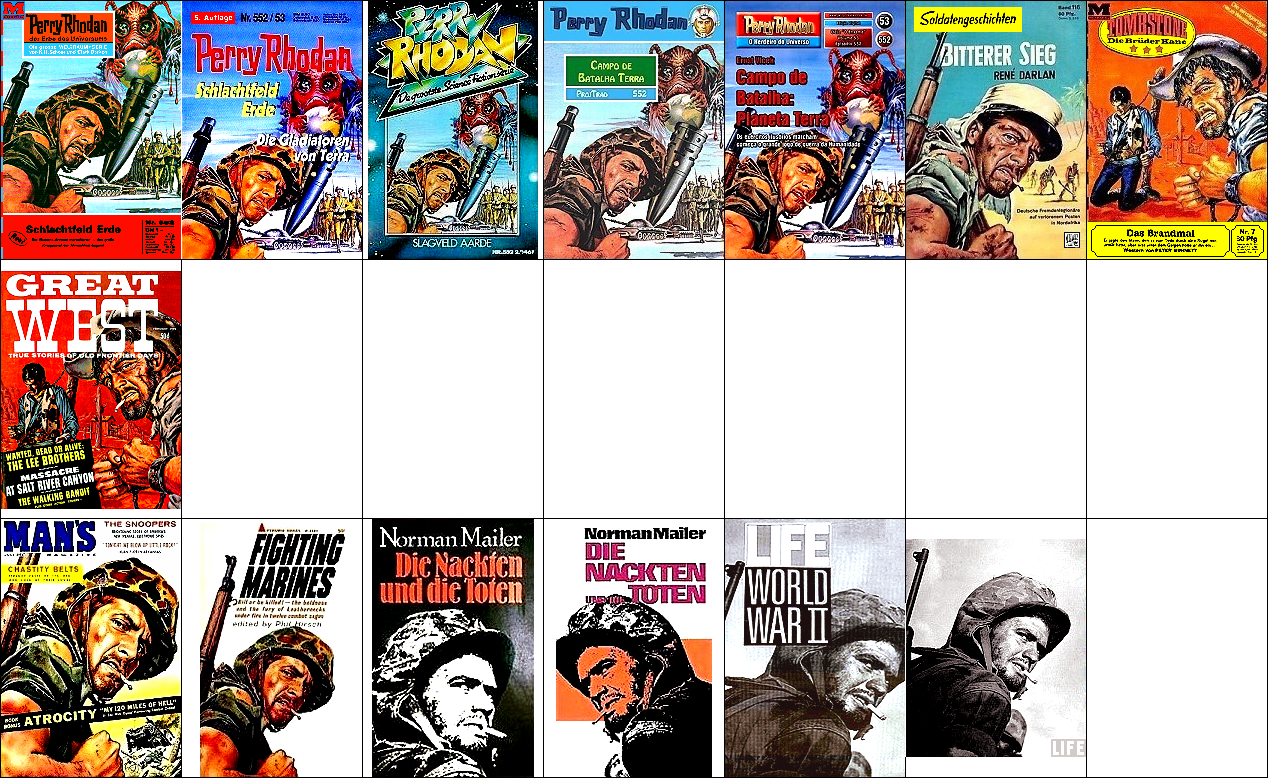 sehr ähnliches Motiv und Gesichtsausdruck, Hintergrund unterschiedlich, 1 - 5, 7 - 8 gleiches Bild, 15 bzw. 16 Vorbild für Nachzeichnungen bzw. Übernahme als Collage, Vorbild dafür ist wahrscheinlich das Foto in 20, das auch für die Titelbilder in 17 - 19 verwendet wurde |