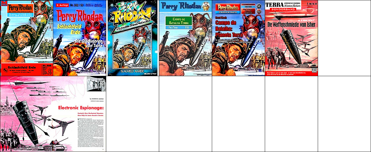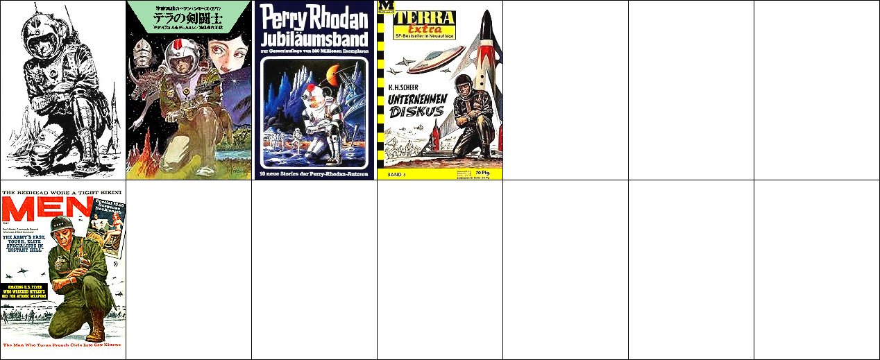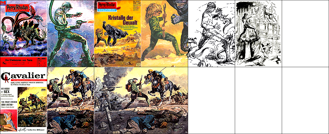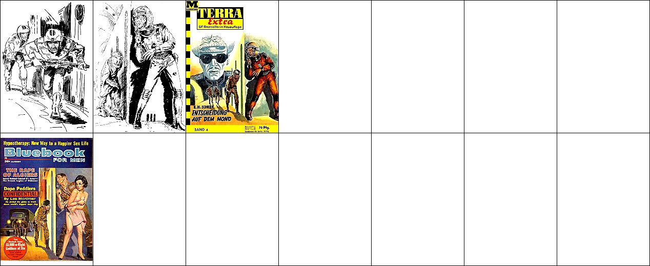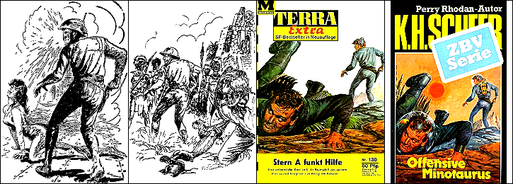 der Außerirdische in 2 hat die gleiche Körperhaltung, 2 und 3 fast gleiche Szene mit dem Mann hinter der Kante, 8 Vorbild für Nachzeichnungen |