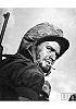 Soldat mit Stahlhelm und Zigarette, der zurück blickt |