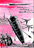 Soldat mit Stahlhelm und Zigarette, der zurück blickt, daneben bombenförmiges Gerät mit Außerirdischem, Soldatengruppe und Panzer |