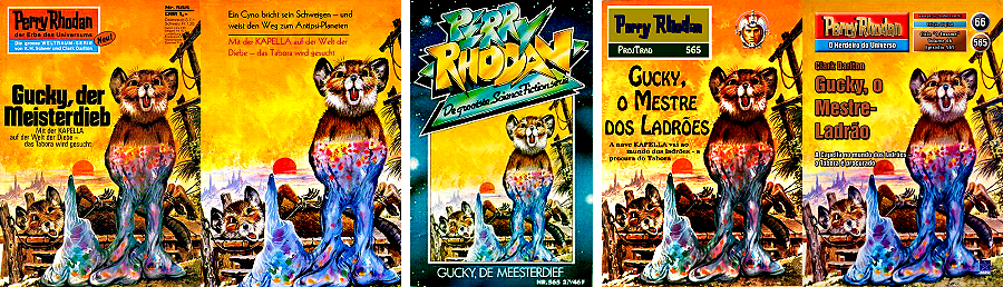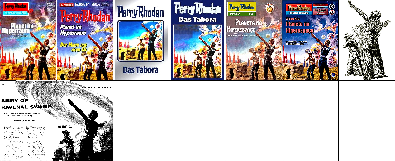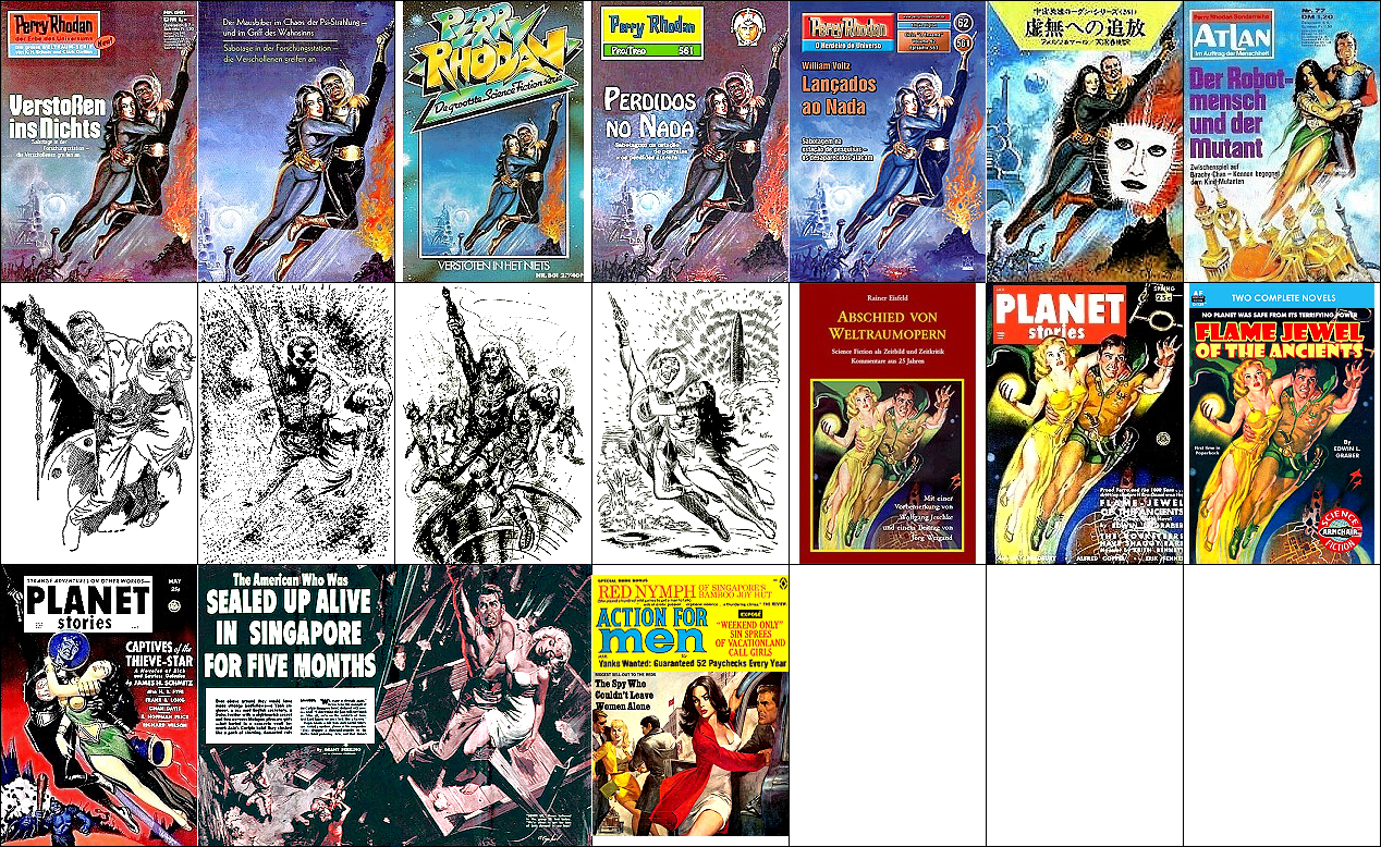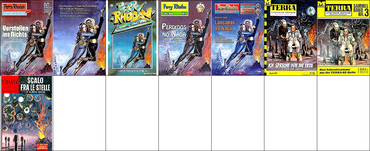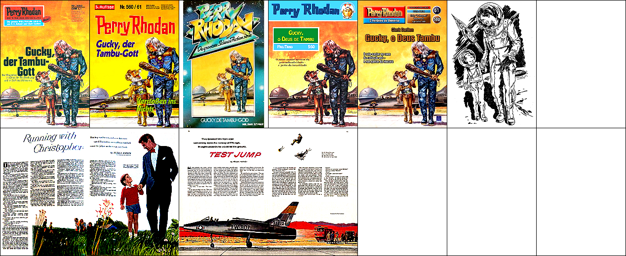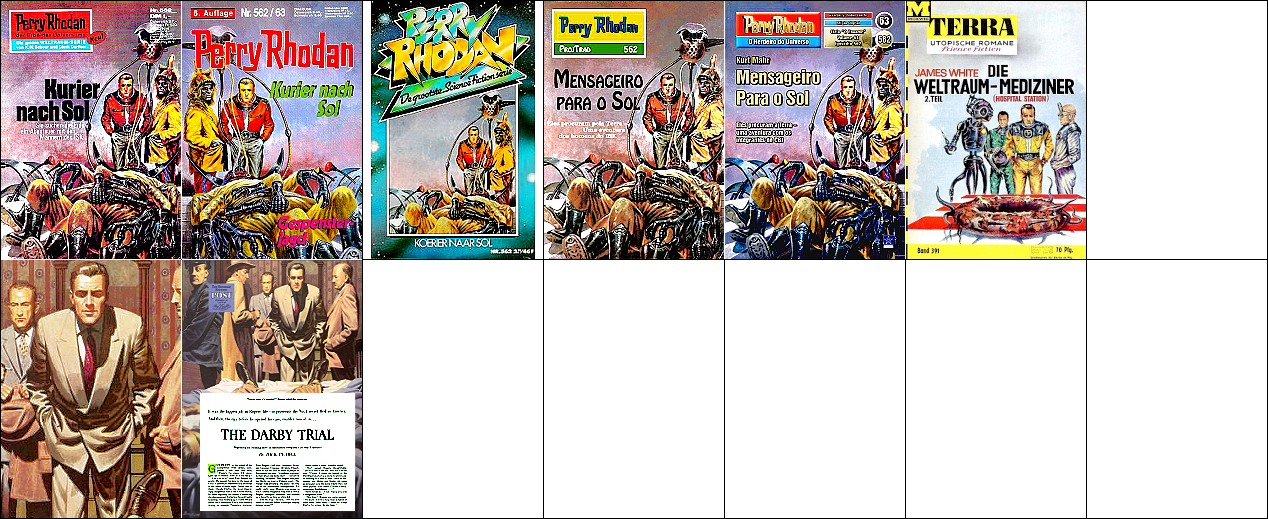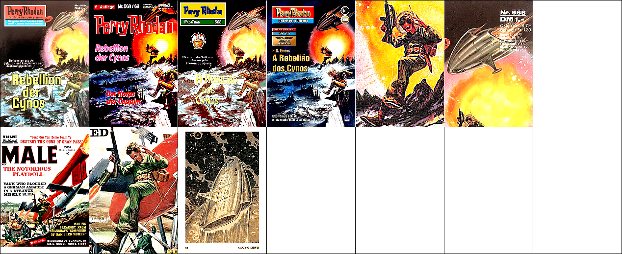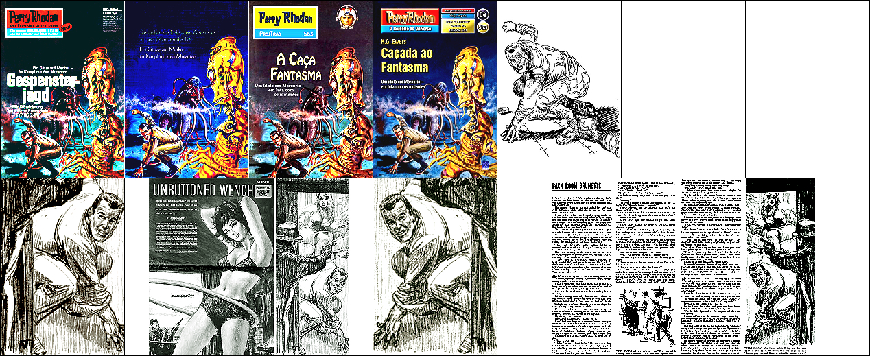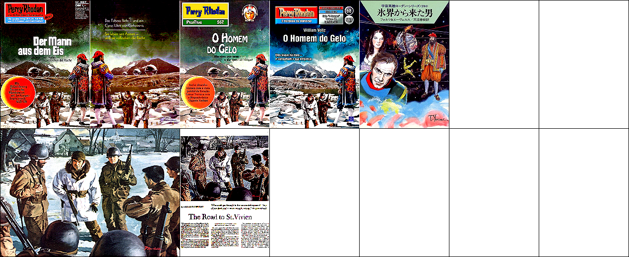 1 - 4 gleiches Bild, 2 seitenverkehrt, in 5 der Mann für die japanische Ausgabe neu interpretiert, die beiden Männer unten sind von 8 übernommen |