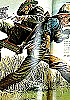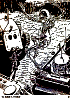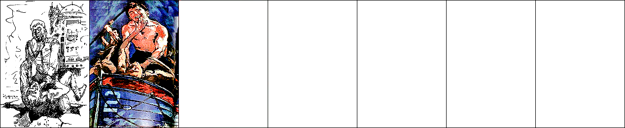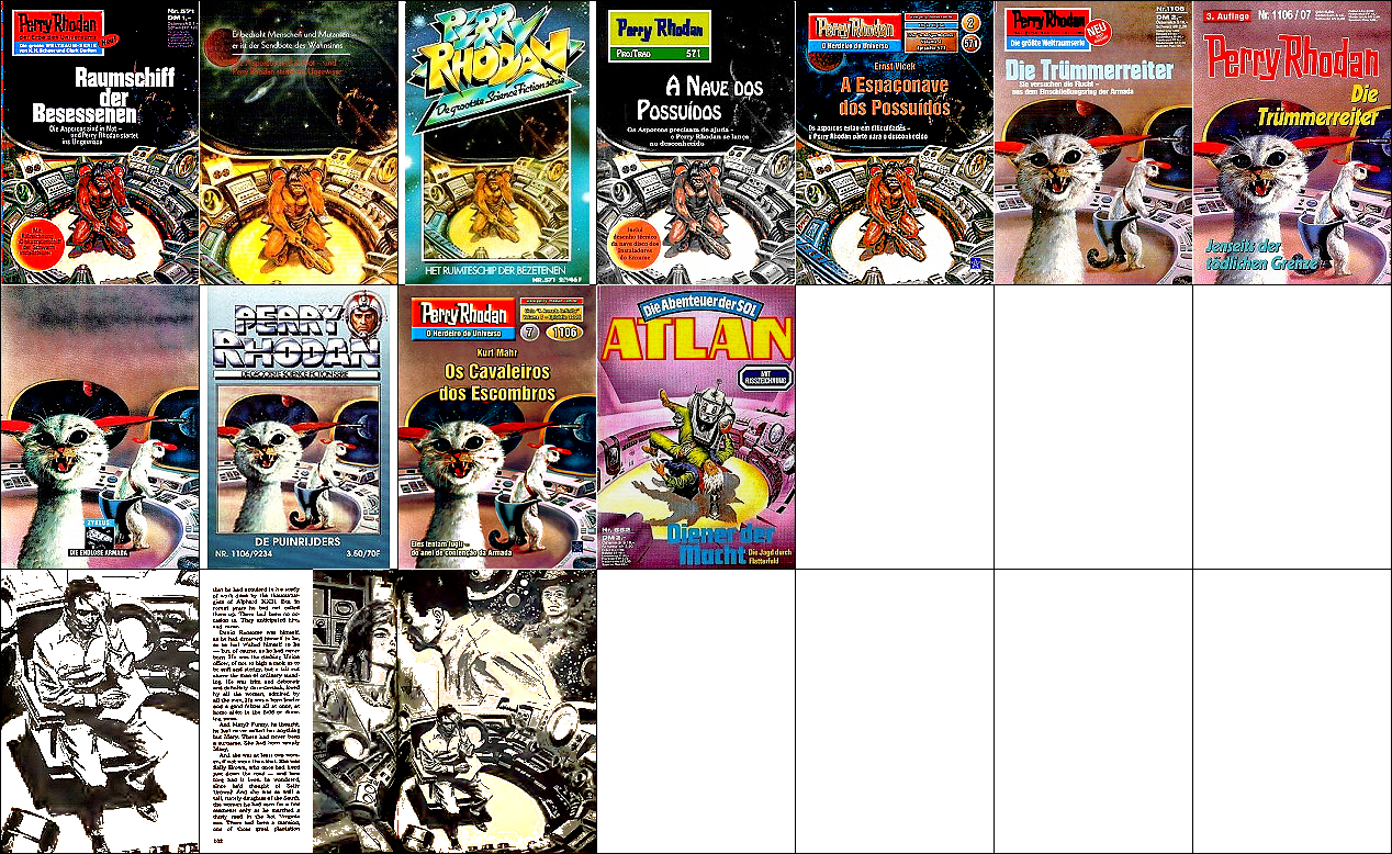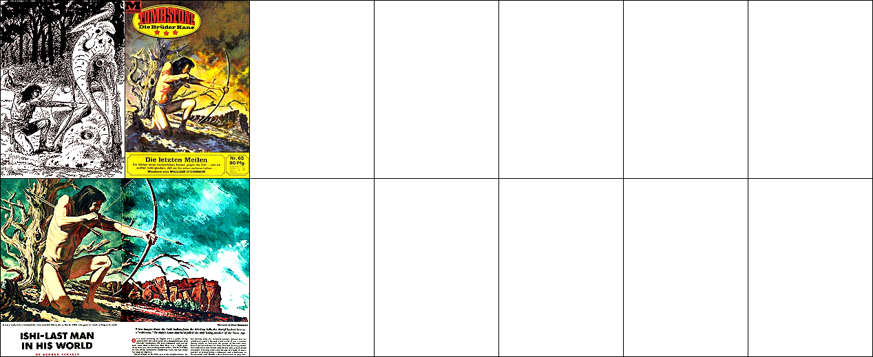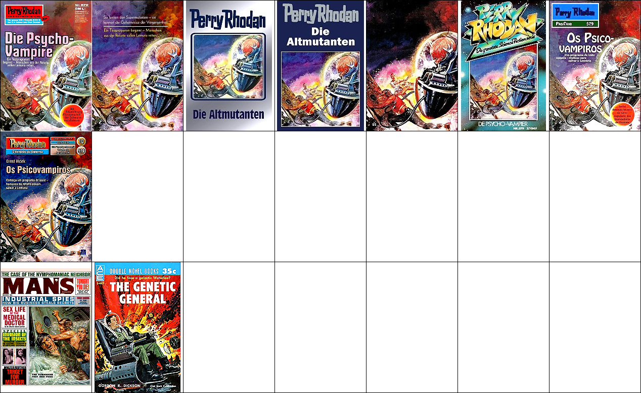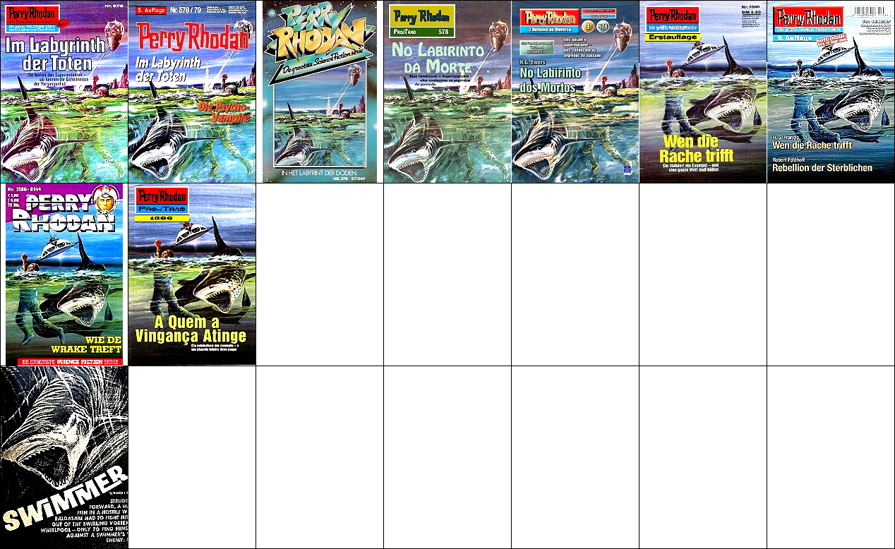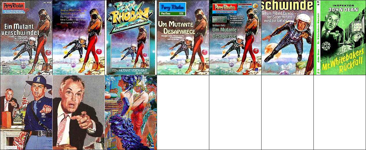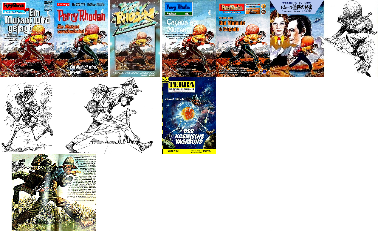 1 - 5 gleiches Bild, 6 Nachzeichnung für jap. Ausgabe, 7 ähnliches Motiv mit etwas anderer Körperhaltung s/w, seitenverkehrt, 8 geringfügig ähnliches Motiv, ein mit langem Schritt ausschreitender Mann findet sich auch in 9 und 10 wieder und ist von 15 nachgezeichnet |