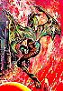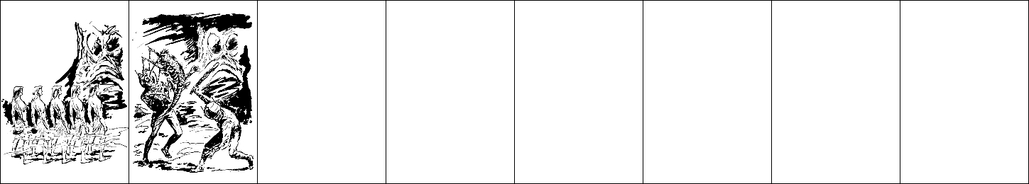 Gruppe von gleich aussehenden Männern, im Hintergrund froschartiges Dämonengesicht |