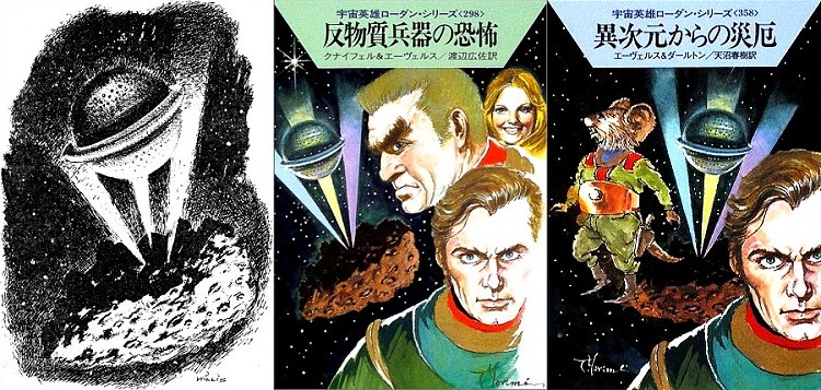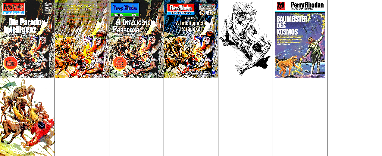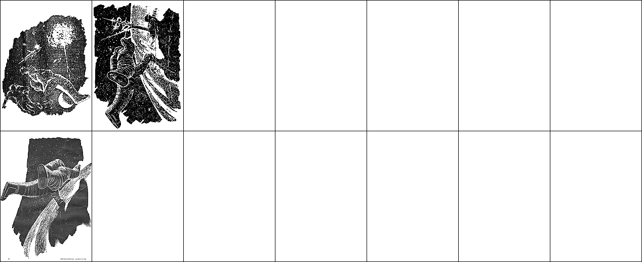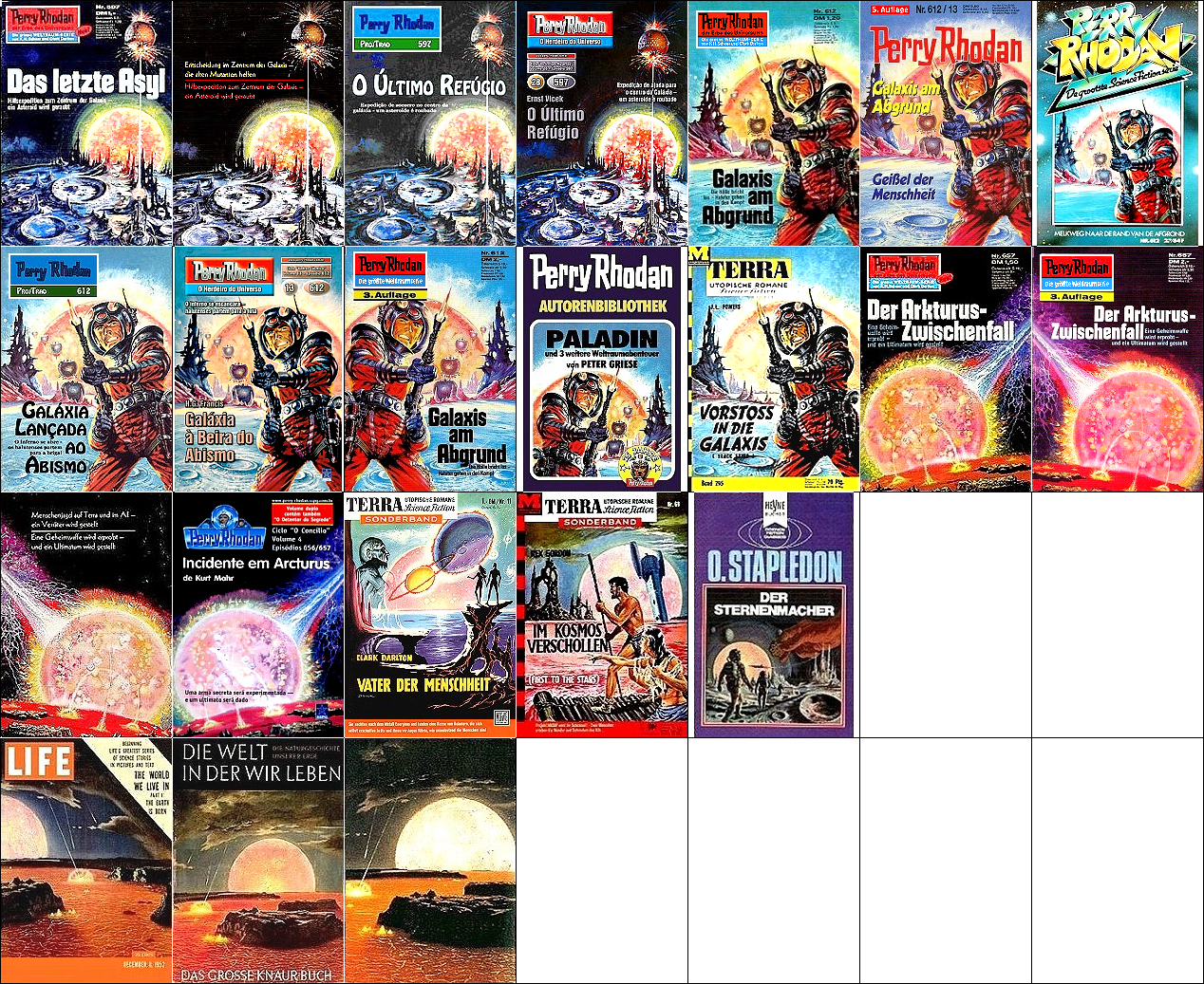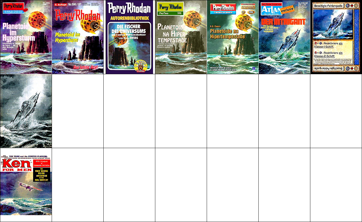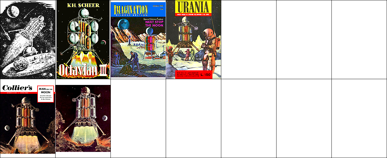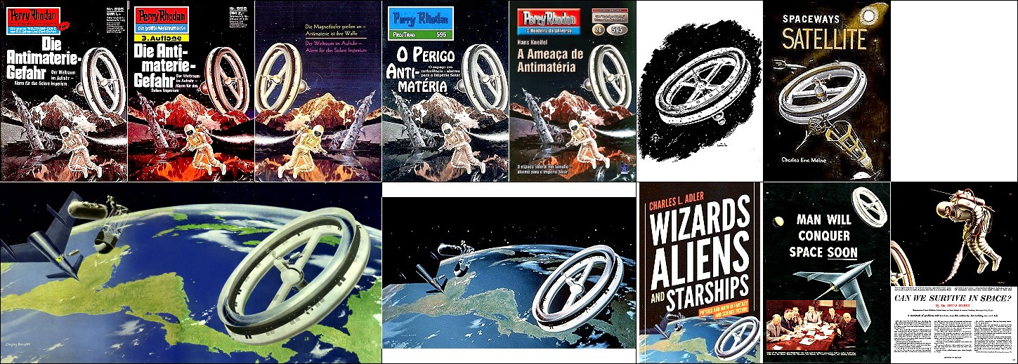 1 - 5 gleiches Bild, 3 seitenverkehrt, 6 - 7 Raumstation sehr ähnlich, 8 -10 gleiches Bild, Vorbild für Raumstation, die Raumstation kommt auch in 11 vor, in 12 findet sich das Vorbild für den Raumfahrer in 1, wenngleich mit etwas anderer Körperhaltung, aber der Raumanzug ist das gleiche Modell |