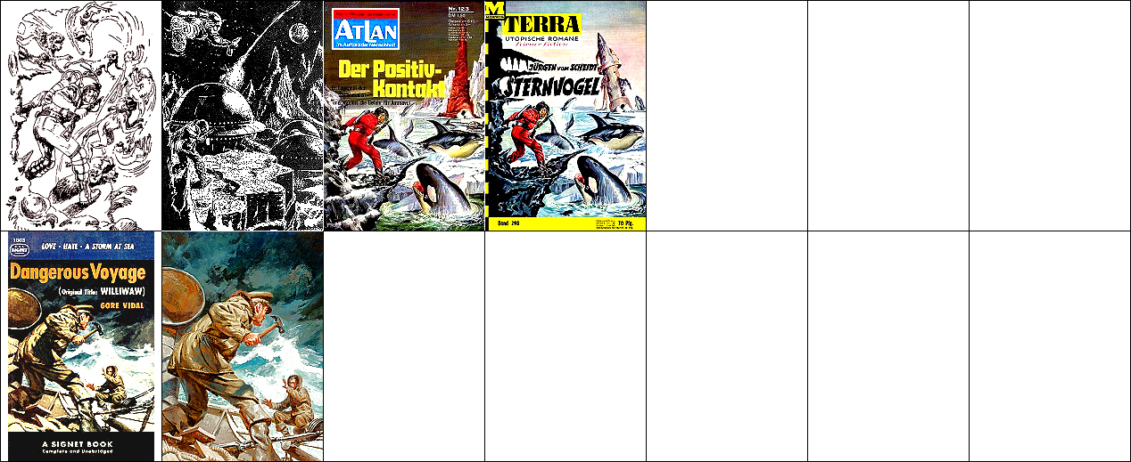 1 - 5 gleiches Bild, 3 gespiegelt, die Meeresszene findet sich auch in 6 und ist von 15 nachgezeichnet, 6 - 8 gleiches Bild |