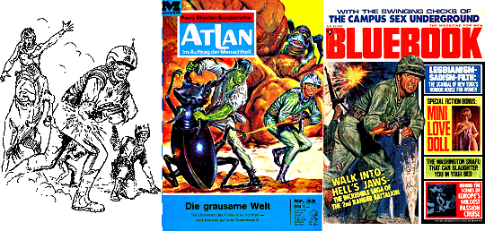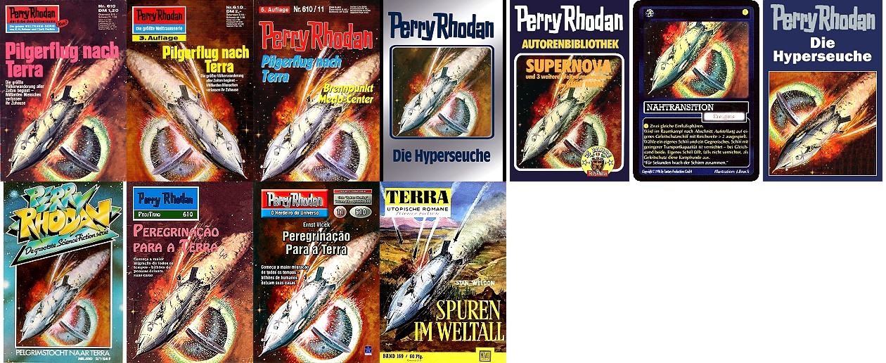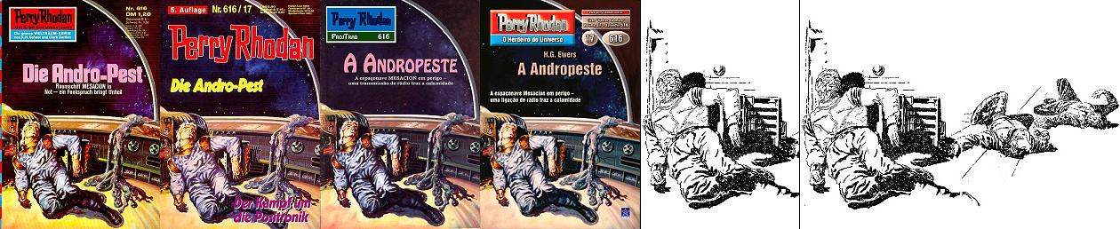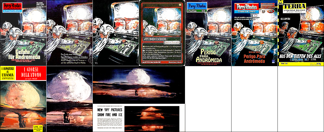 1 - 6 gleiches Bild, leichte Überarbeitung von 7 (Raumhelm ergänzt), die Atomexplosion ist wahrscheinlich durch 8 oder 9 inspiriert |