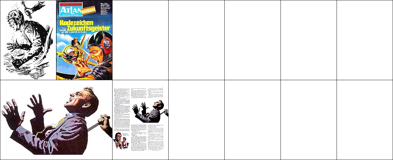 1 - 4 gleiches Bild, in 5 und 6 kommt ein ähnlicher Außerirdischer vor, 8 Vorbild für Nachzeichnungen |