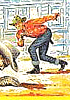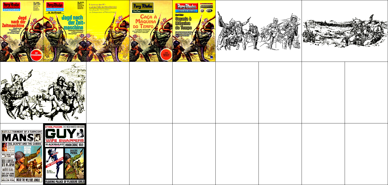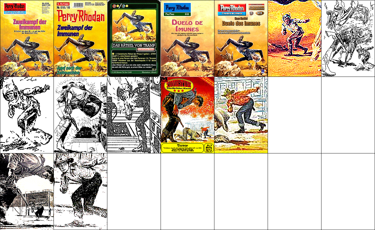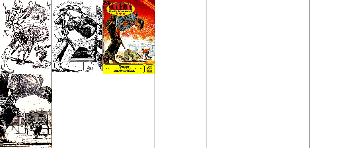 1 - 6 gleiches Bild, der schießende Mann im Hintergrund kommt auch in den weiteren Bildern vor und ist von 15 nachgezeichnet, die Bilder ab 7 zeigen komplett die gleiche Szene |