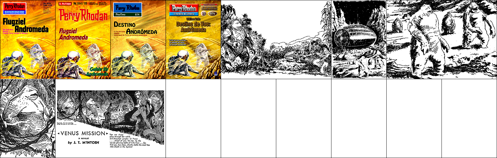 1 - 10 gleiches Bild, 2 seitenverkehrt, 7 umgedreht, Raumschiff von 11 nachgezeichnet, Hintergrund unterschiedlich |
