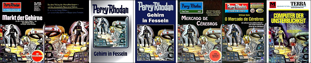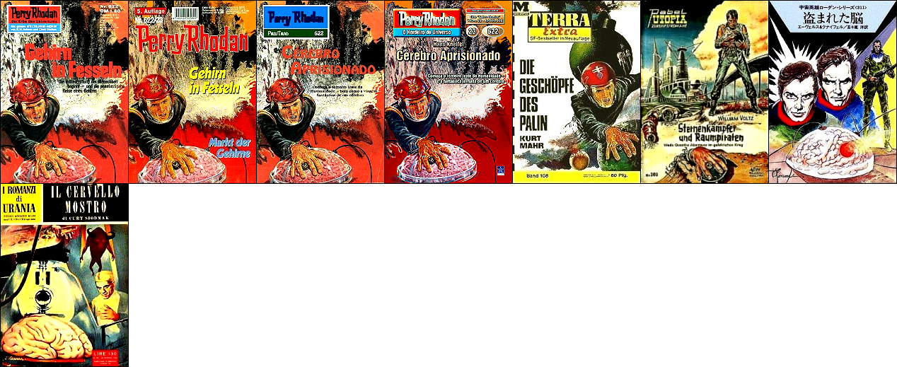 1 - 4 gleiches Bild, Raumfahrer von 5 übernommen und mit Gehirn und Hintergrund ergänzt, in 6 gleiche Hand sichtbar, 7 Neuinterpretation von 1 für japanische Ausgabe, 8 Gehirn ähnlich |