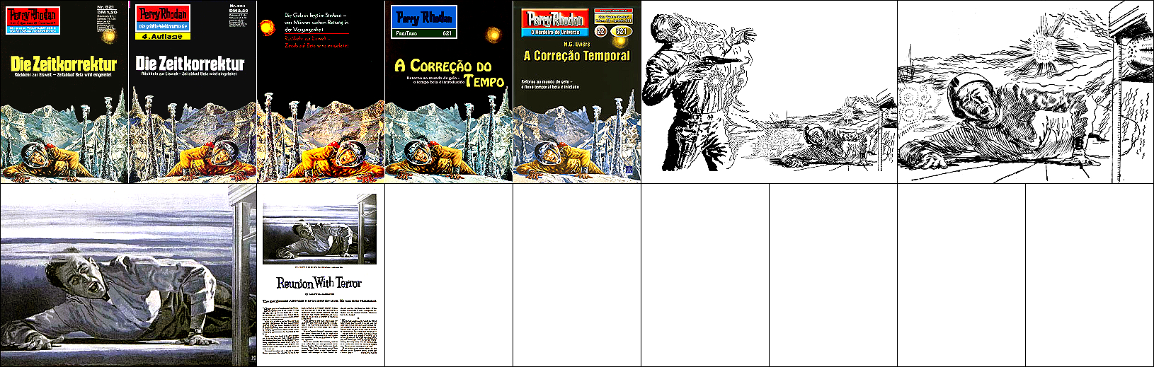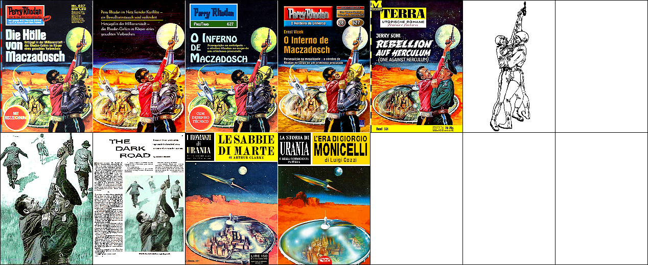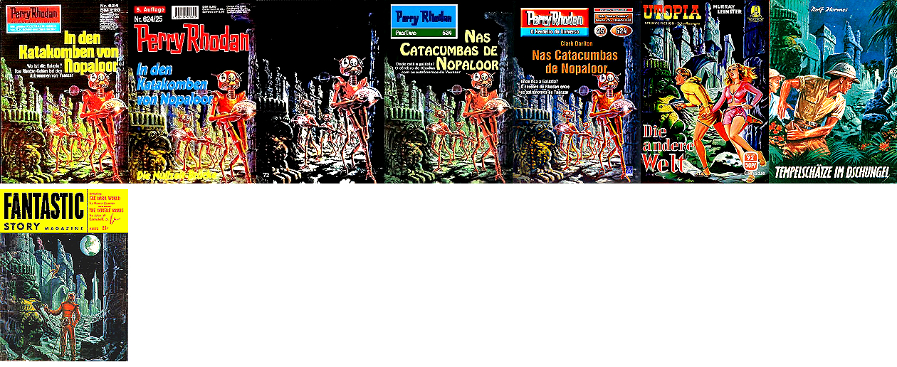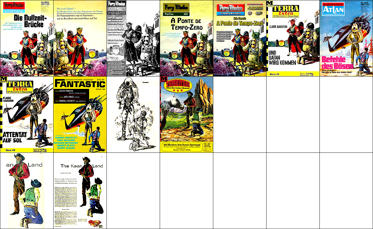 1 - 5 gleiches Bild, leichte Überarbeitung von 6, 2 seitenverkehrt, 3 s/w, 7 - 9 gleiches Bild mit überarbeitetem Hintergrund, 10 sehr ähnlich 7 - 9, der Außerirdische ist hier ein Twonoser, 11 sehr ähnlich als Westernszene, 15 ist Vorbild für alle anderen Bilder |