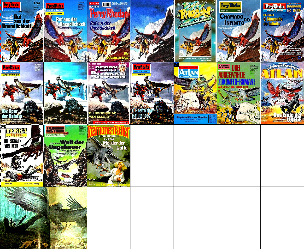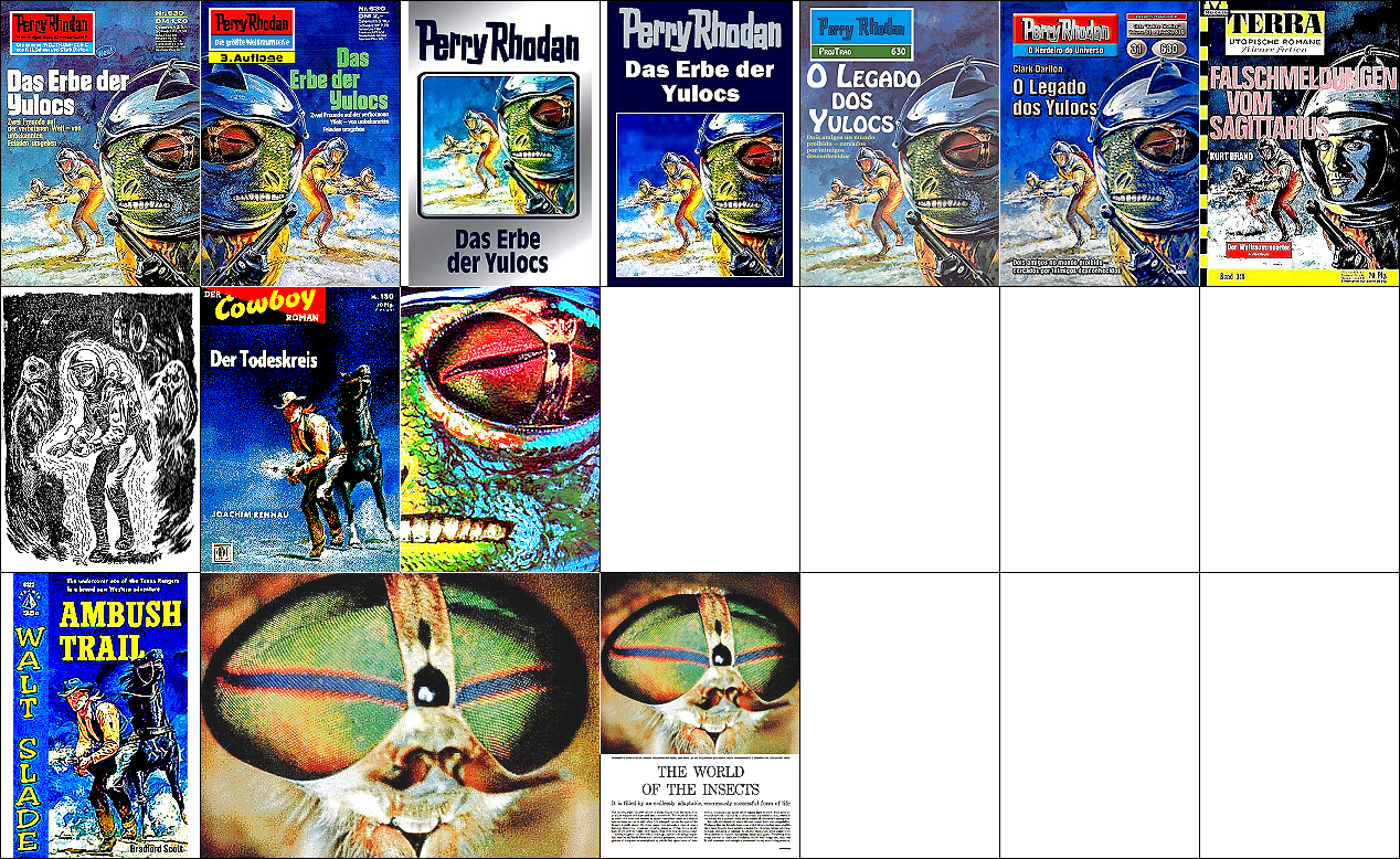 1 - 6 gleiches Bild, 2 seitenverkehrt, Überarbeitung von 7 mit verändertem Kopf, in 8 und 9 hat der schießende Mann die gleiche Körperhaltung, 9 ist 1:1 von 15 nachgezeichnet, das Facettenauge in 1 ist von einer Insektenabbildung aus 16 übernommen |