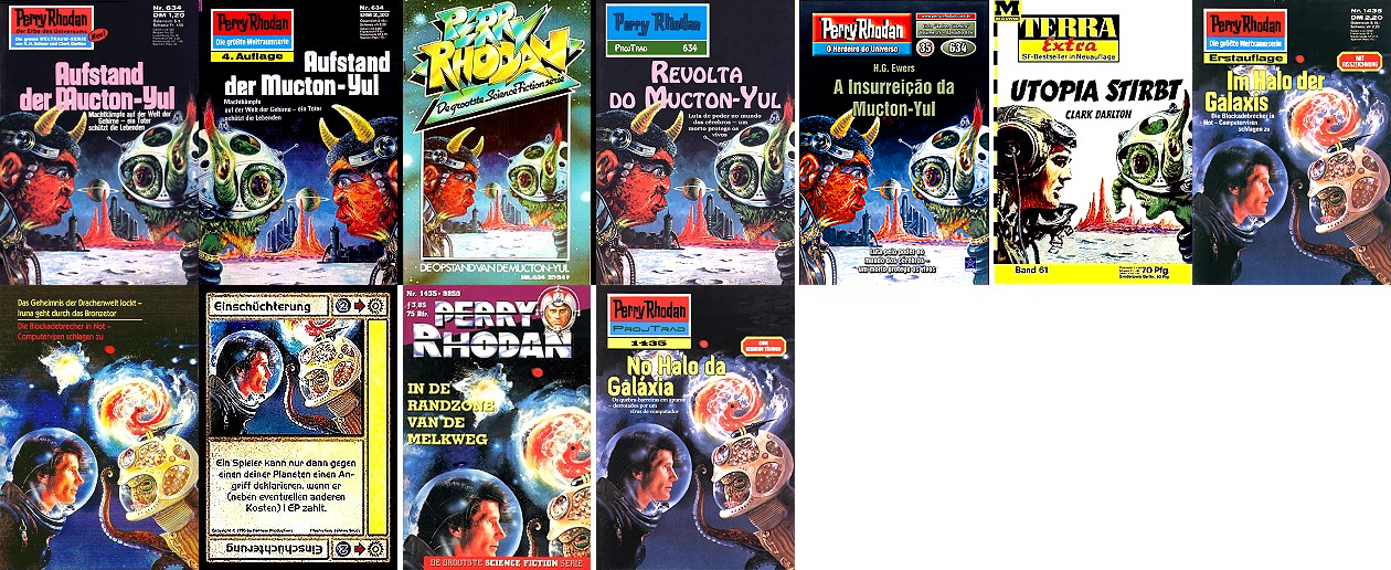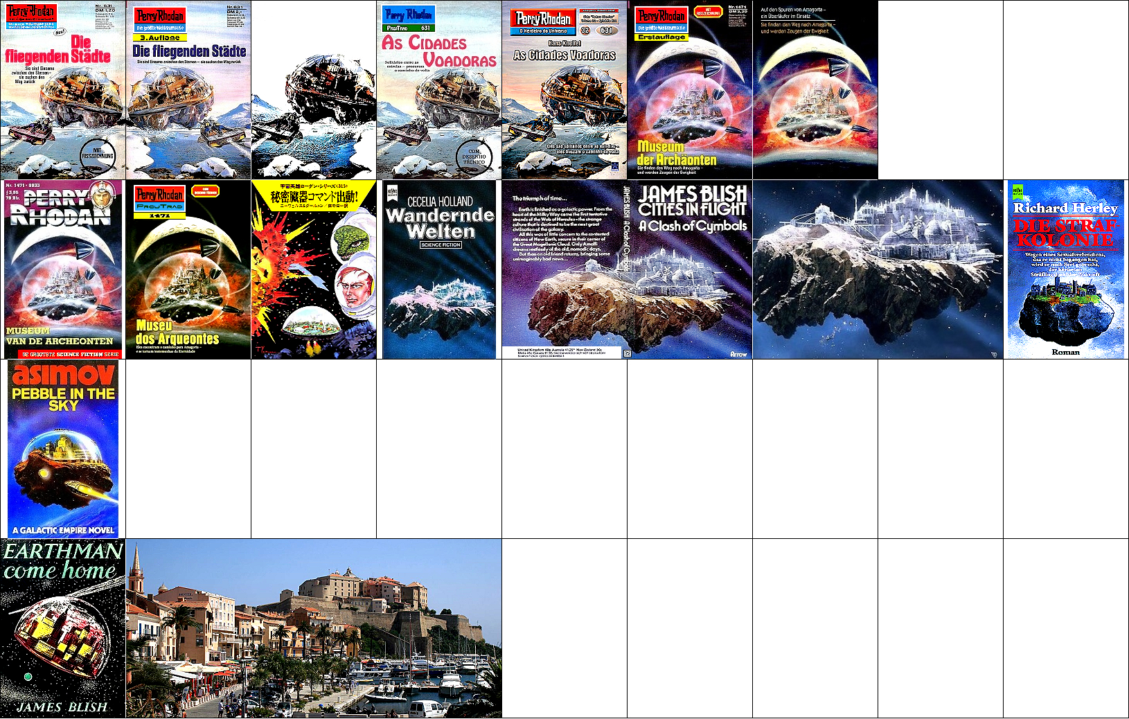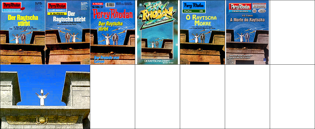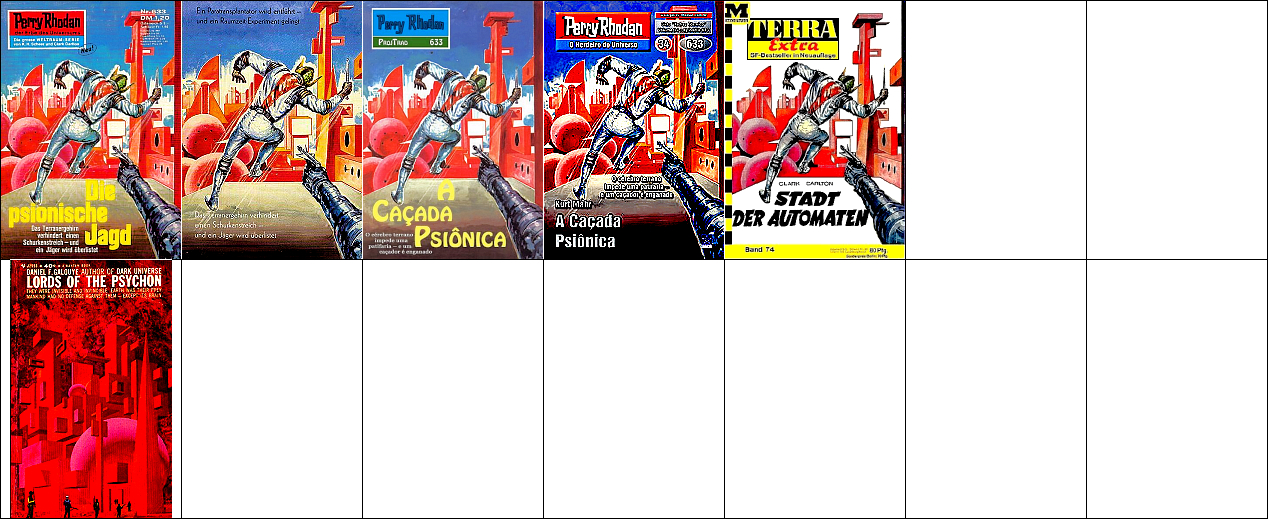 1 - 4 gleiches Bild, Überarbeitung von 5, die Hochhausstadt im Hintergrund ist von 8 inspiriert (man beachte die kugelförmigen Gebäude) |
