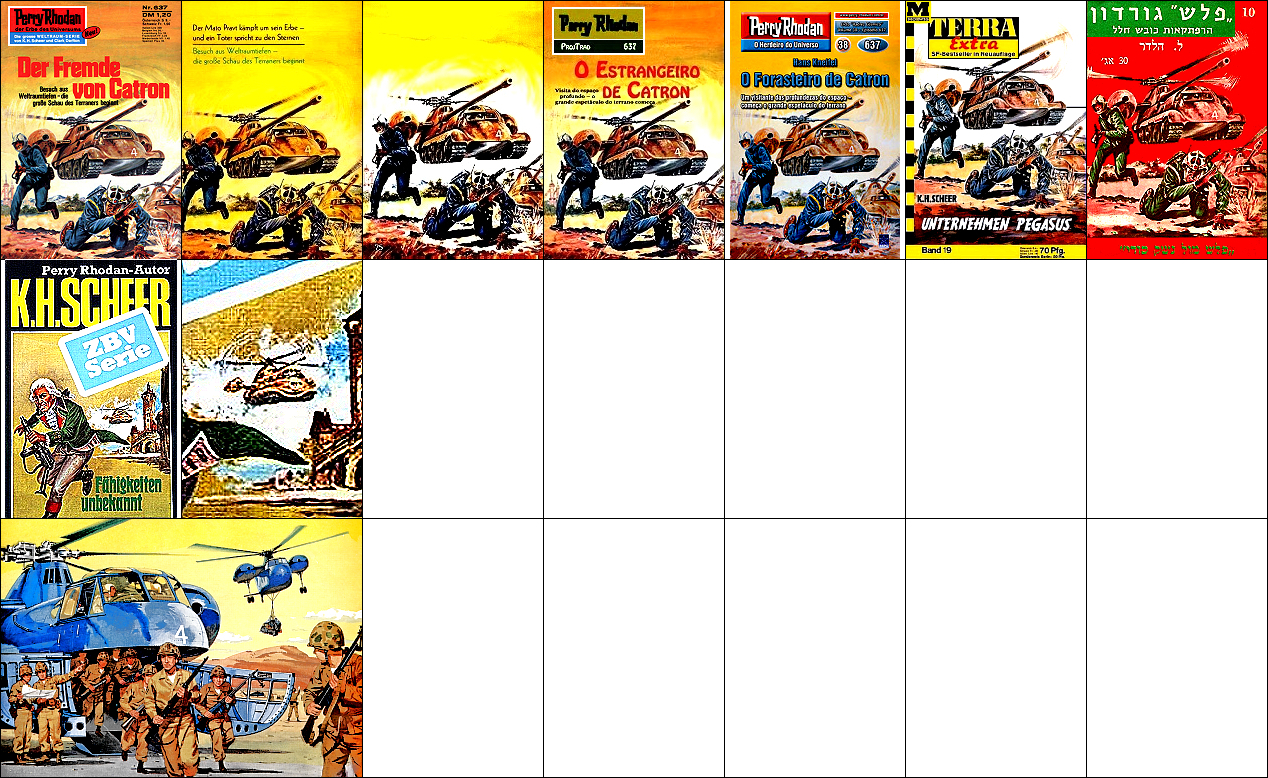 1 - 5 gleiches Bild, Überarbeitung von 6, 7 mit überarbeitetem Hintergrund. Ein ähnliches Modell kommt auch in 8 vor, der Hubschrauber in 15 diente teilweise als zeichnerisches Vorbild (man beachte z. B. die Propeller) |