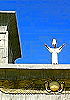 Priester mit erhobenen Händen und Raumfahrer stehen auf Tempeldach |