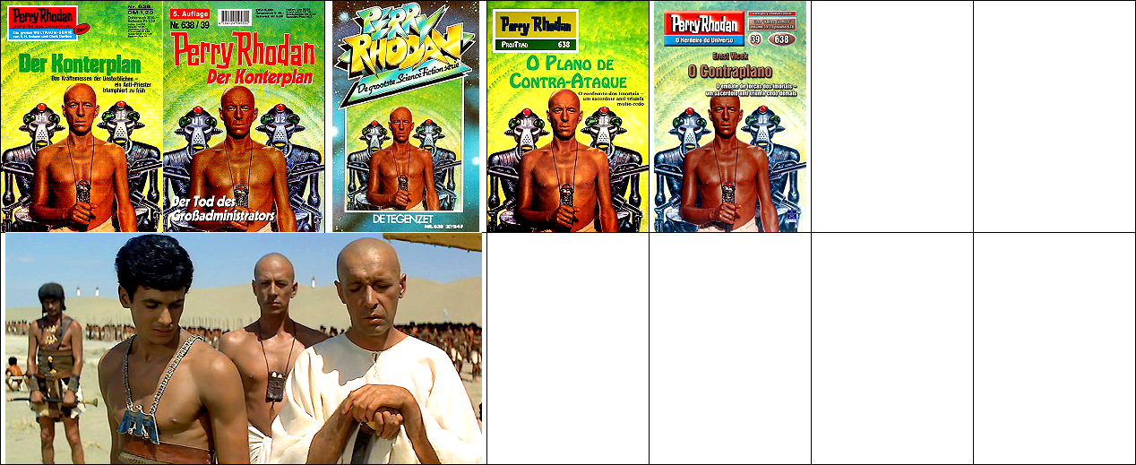 1 - 5 gleiches Bild, 2 seitenverkehrt, 6 - 8 gleiches Bild, 8 Hintergrund bearbeitet, 9 - 11 gleiches Bild. Der liegende Mann aus 1 findet sich auch in 6 - 8, in 9 - 11 sind die beiden mit Vogelköpfen ausgestatteten Menschen aus 6 - 8 wiederzufinden. Die Szenen sind aus dem Film "Pharao" (Bilder 15 - 19) entnommen. |