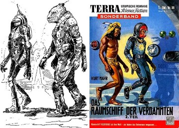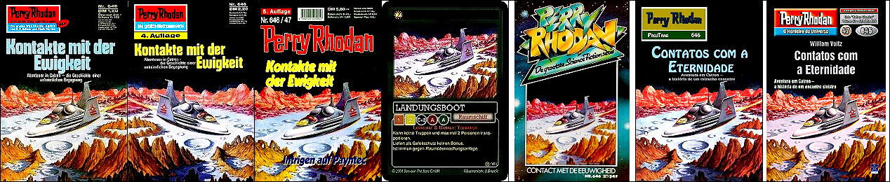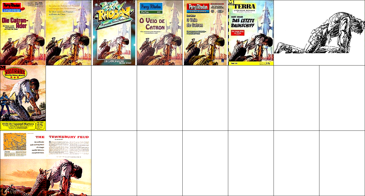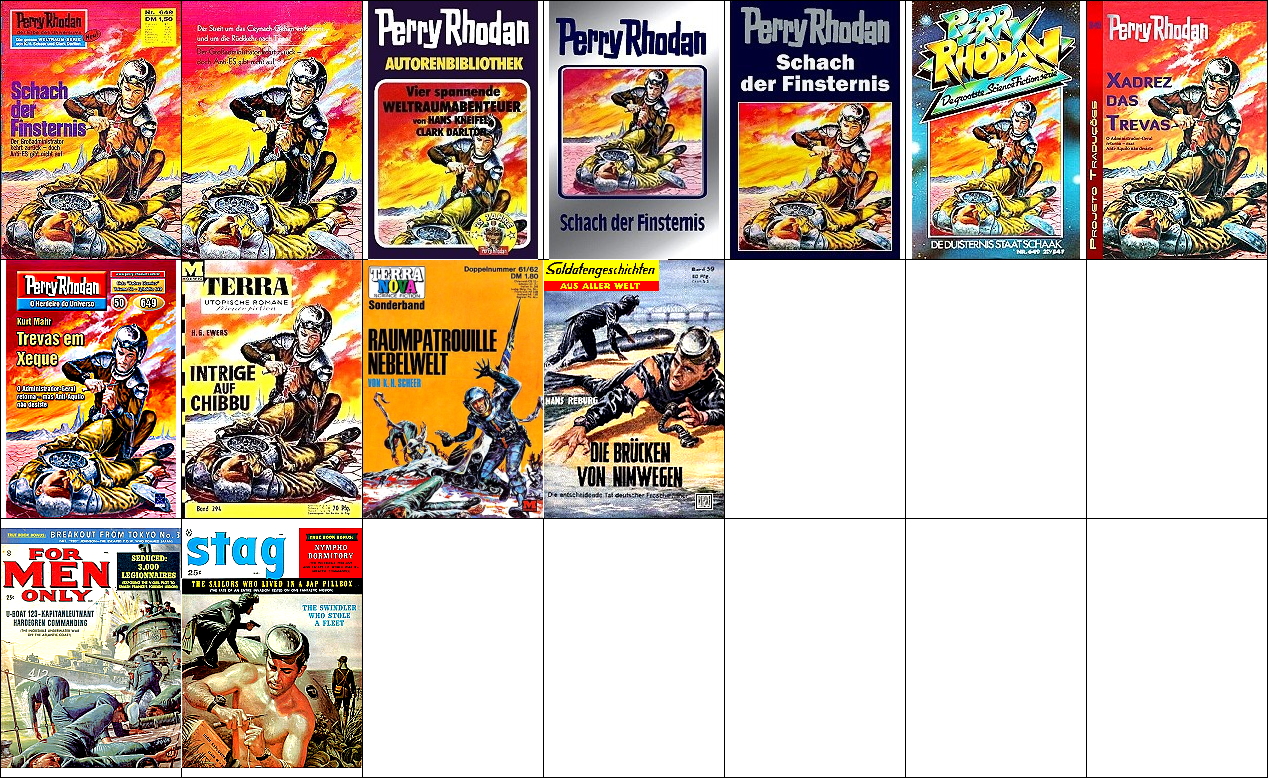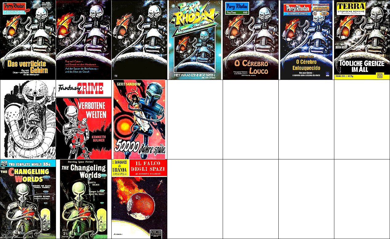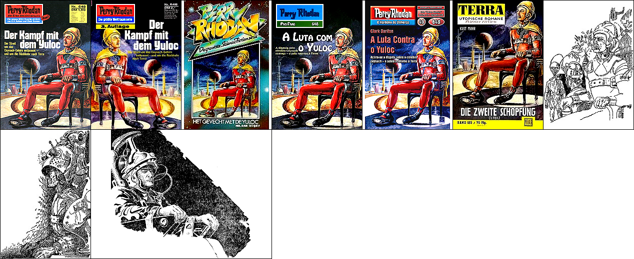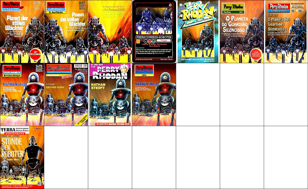 1 - 6 gleiches Bild, von 7 leicht überarbeitet (die Augenschlitze sind beleuchtet und die Sternnebel im Hintergrund verändert), weitere ähnliches Motiv, 15 - 16 gleiches Bild, Vorbild für Nachzeichnungen des Roboters, das brennende Raumschiff in 1 wurde seitenverkehrt von 17 nachgezeichnet |