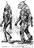 2 Männer/Roboter/Außerirdische gehen im Gleichschritt hintereinander |