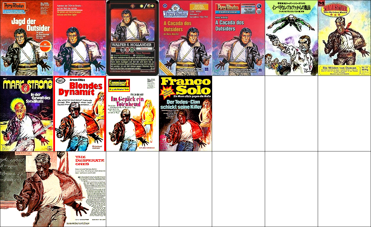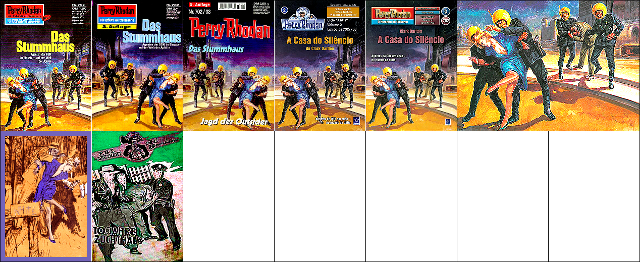 sehr ähnliches Motiv, 1 - 5 gleiches Bild, 4 und 5 seitenverkehrt, 6 Neuinterpretation für japansiche Ausgabe, 9 - 11 gleiches Bild mit überarbeitetem Hintergrund, 15 Vorbild für Nachzeichnungen |