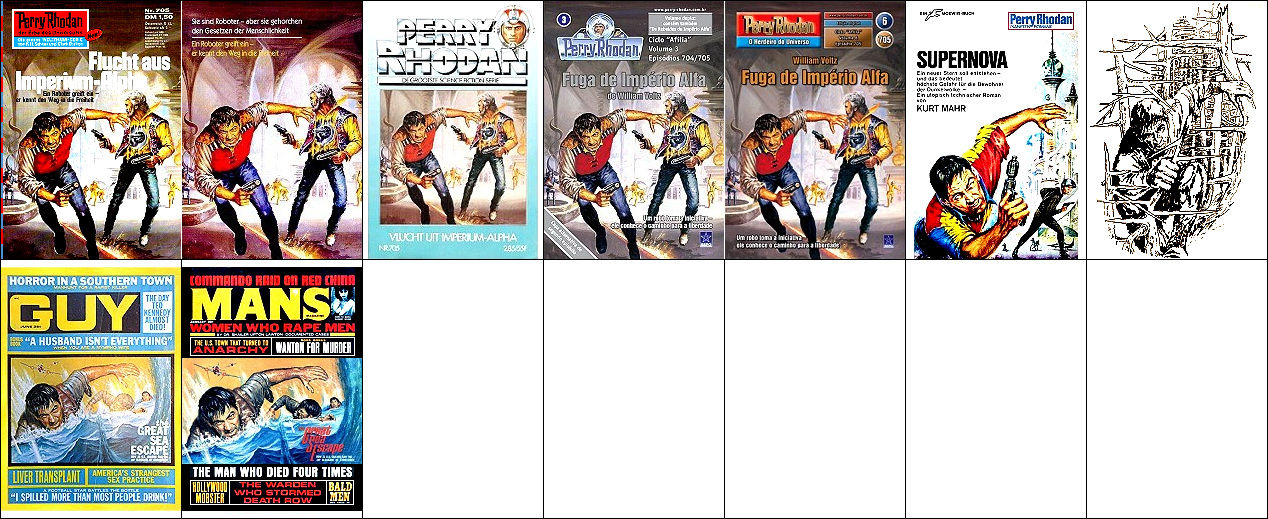 1 - 11 gleiches Bild, 10 Rückseite des doppelseitigen Titelbildes, 12 seitenverkehrt, 15 Vorlage für den knienden Mann |