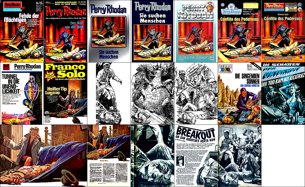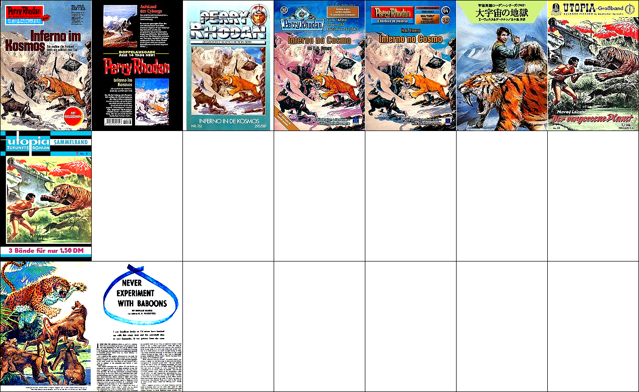 1 - 5 gleiches Bild, 6 Neuinterpretation für japanische Ausgabe, 7 - 8 gleiches Bild, ähnliches Motiv und Körperhaltung, 15 ist seitenverkehrt das Vorbild für die Raubkatze und den Affen in 1 |