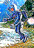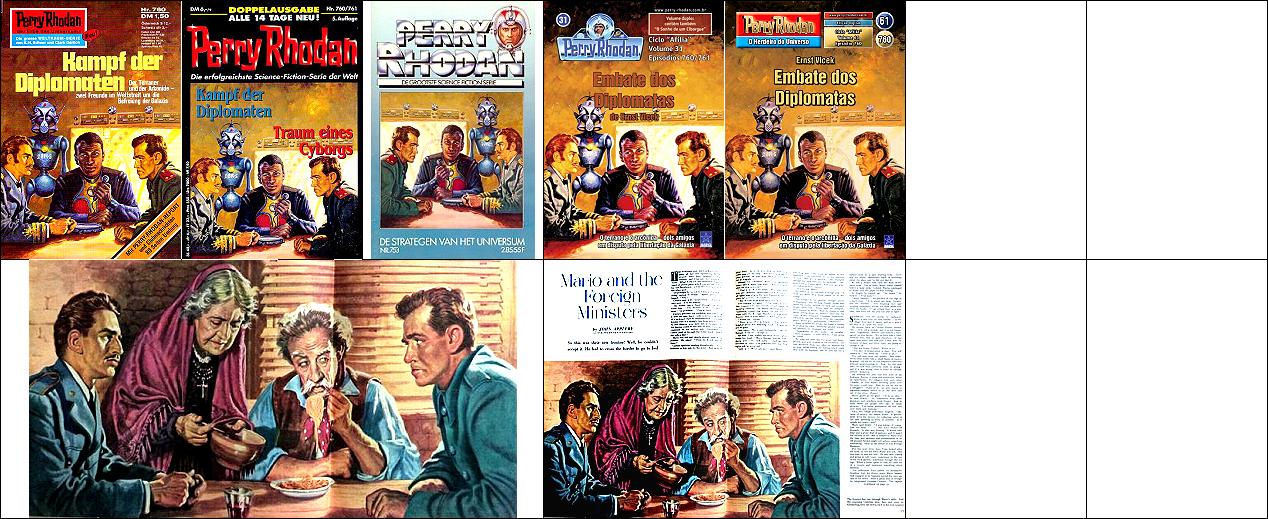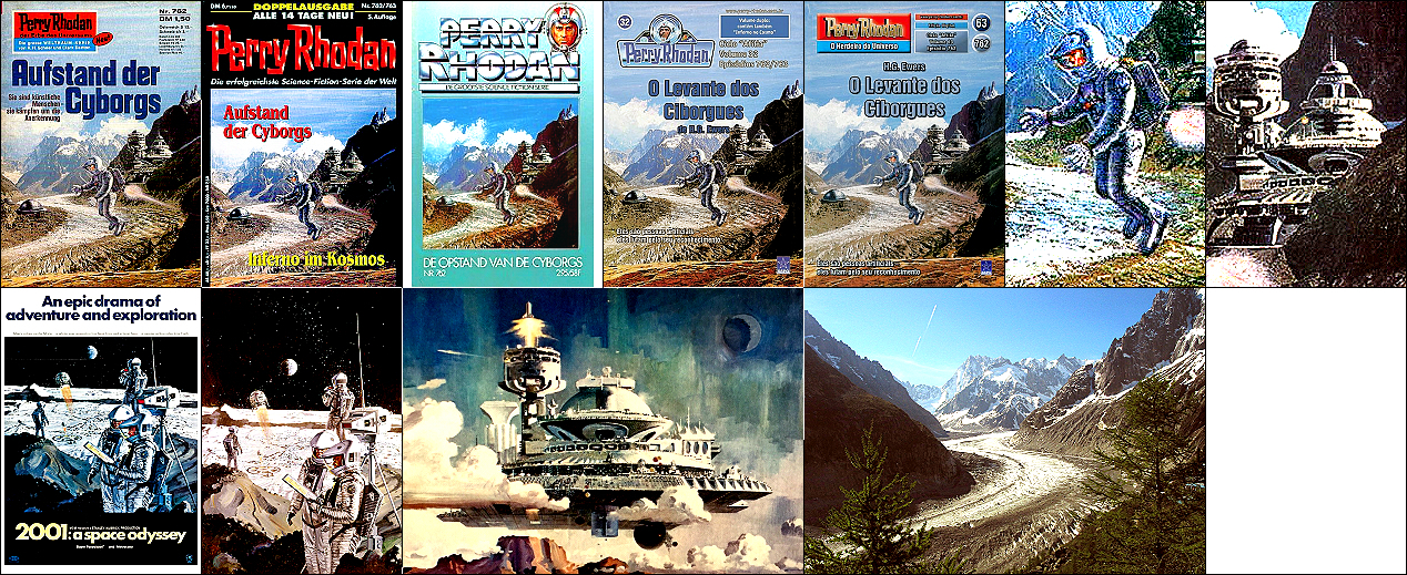 1 - 5 gleiches Bild, der Raumfahrer ist von 8 bzw. 9 nachgezeichnet (man beachte die Form des Helms), die Station im Hintergrund ist vom Raumschiff in 10 nachgezeichnet, die Gletscher- und Bergszenerie zeigt die Landschaft um den Mont-Blanc-Gletscher in 11 |