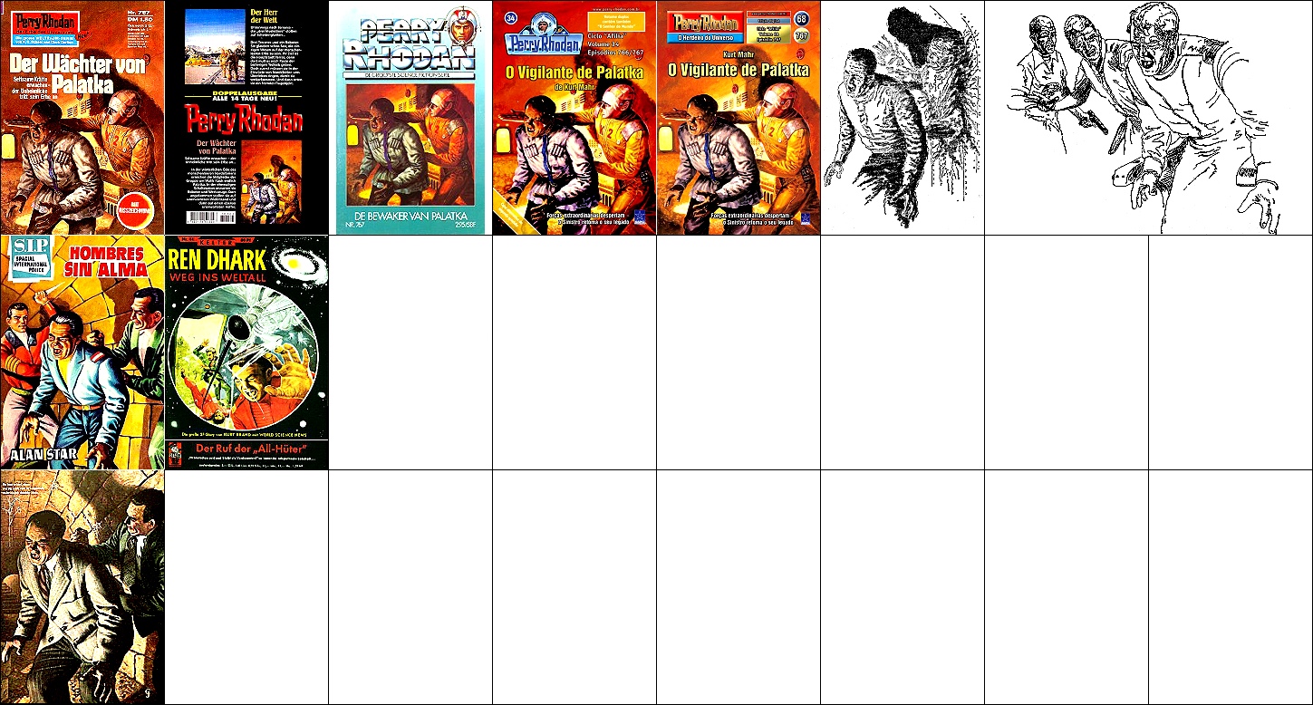 1 - 5 gleiches Bild, 6 sehr ähnliches Motv schwarzweiß, in 7 Mann ähnlich, 8 komplett vom Vorbild nachgezeichnet, in 9 findet sich nur der Mann wieder, 15 Vorbild für Nachzeichnungen |