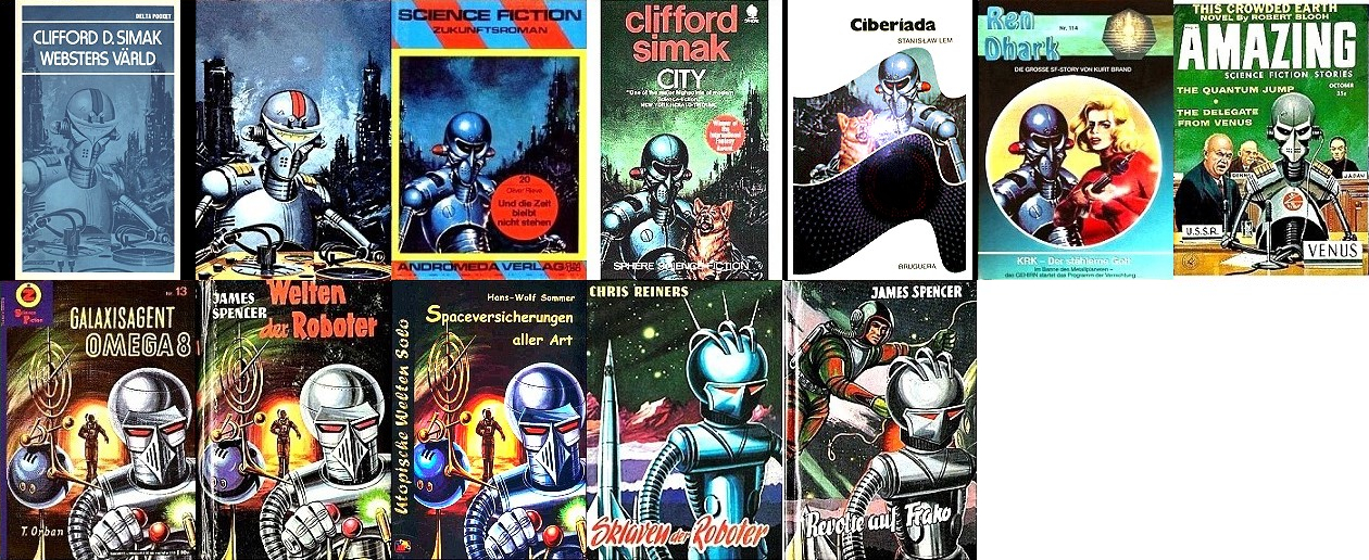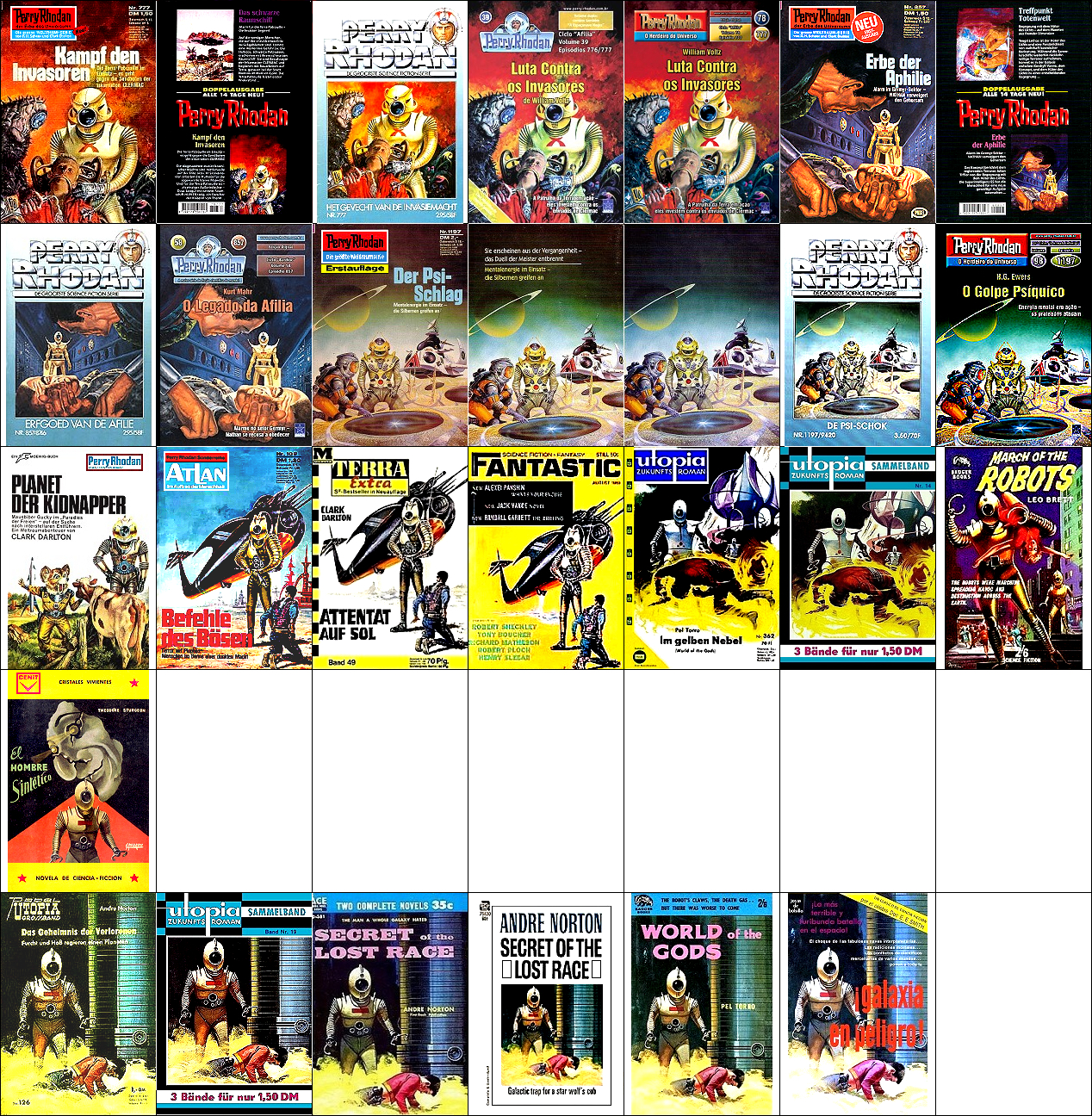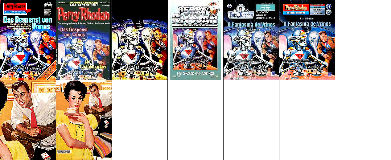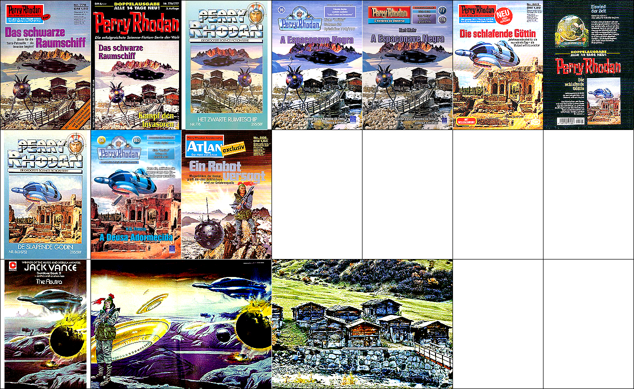 1 - 5 gleiches Bild, 5 seitenverkehrt, ein sehr ähnliches Raumschiff kommt auch in 6 vor, 6 - 9 gleiches Bild, Vorbild für das Raumschiff ist in 15, in 10 kommt ein sehr ähnliches kugelförmiger Satellit wie in 1 vor, die Berghütten zeigen eine Szene aus dem Lötschental in der Schweiz |