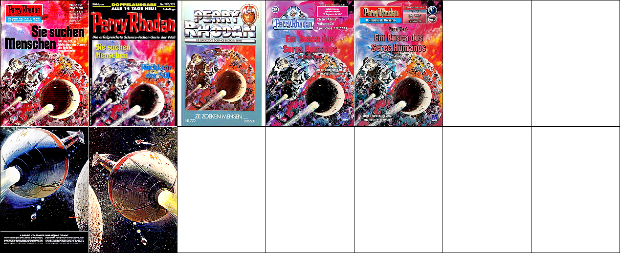 1 - 5 gleiches Bild, die Kugelraumschiffe sind von 8 bzw. 9 nachgezeichnet (man beobachte die kreisförmige Öffnung), 8 und 9 gleiches Bild, gespiegelt |