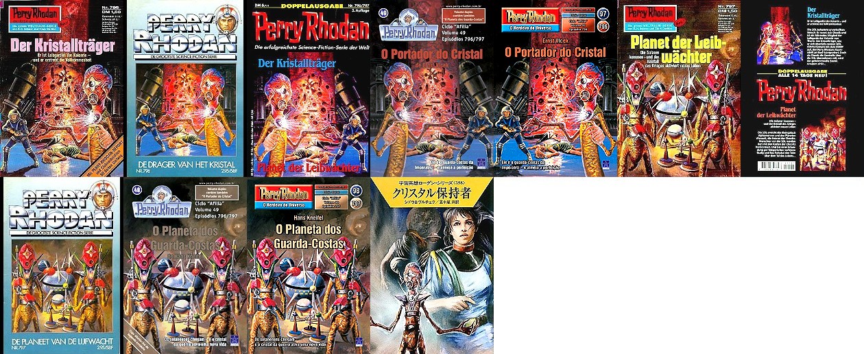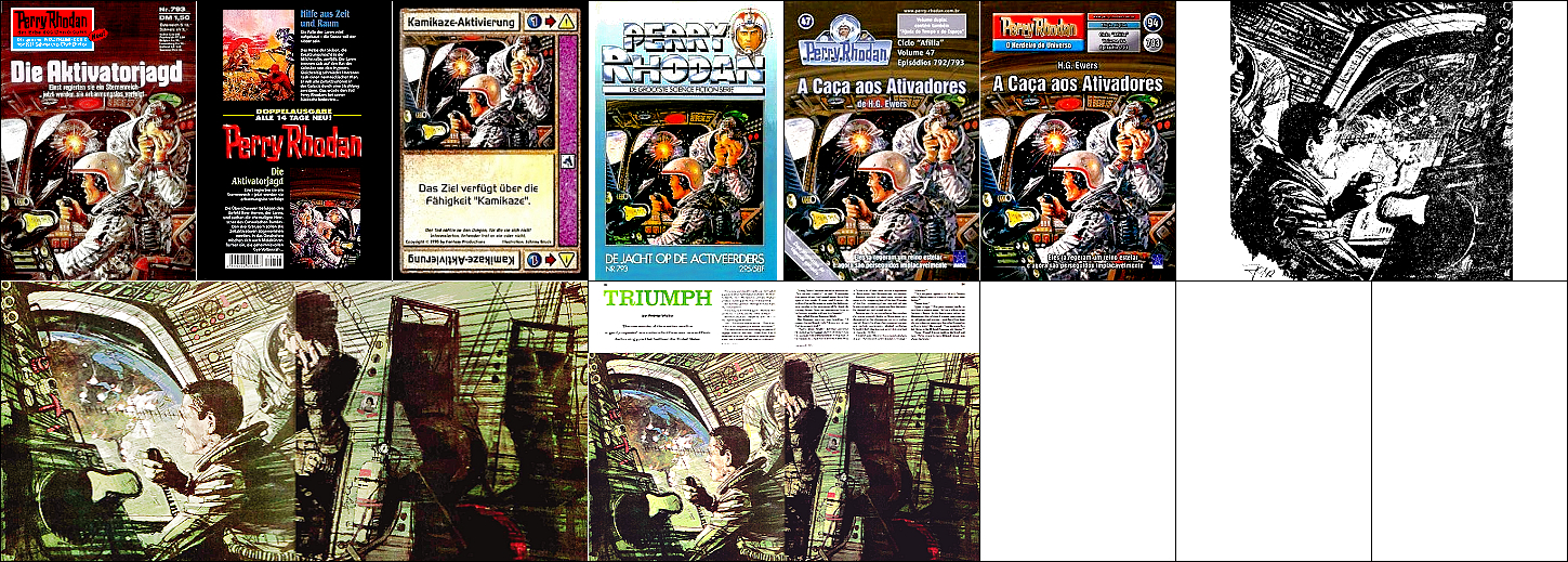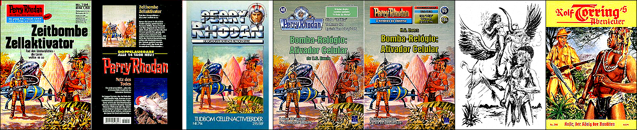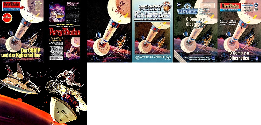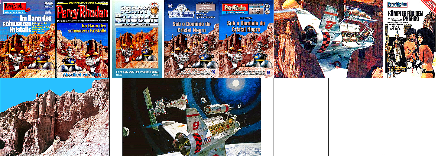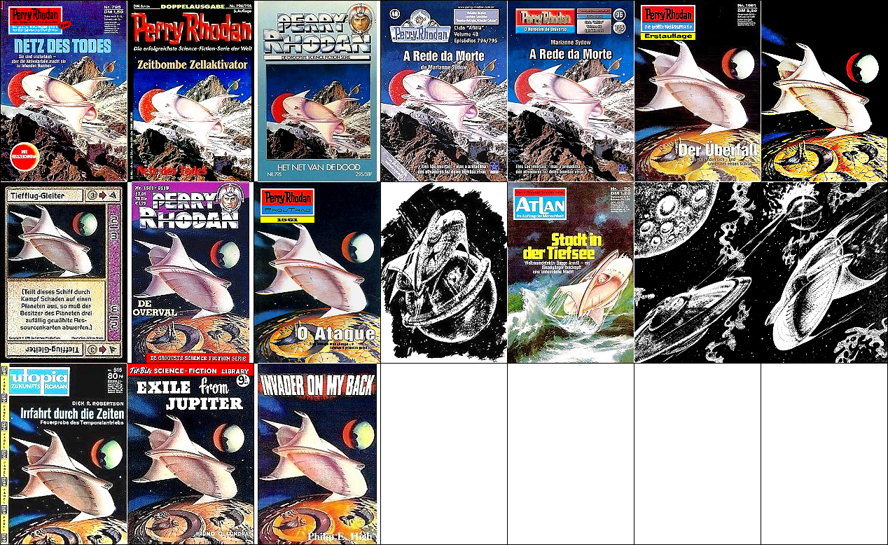 Diskusraumschiff sehr ähnlich, 1 - 5, 6 - 10, 15 - 16 gleiches Bild. Das Titelbild von Bruck in 6 ist mit der Version von Turner in 15 bis auf die höheren Zentralberge im Mondkrater vollkommen identisch, fast nicht auszumachendes Plagiat! |