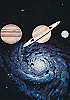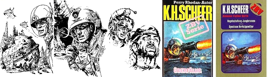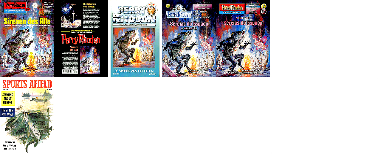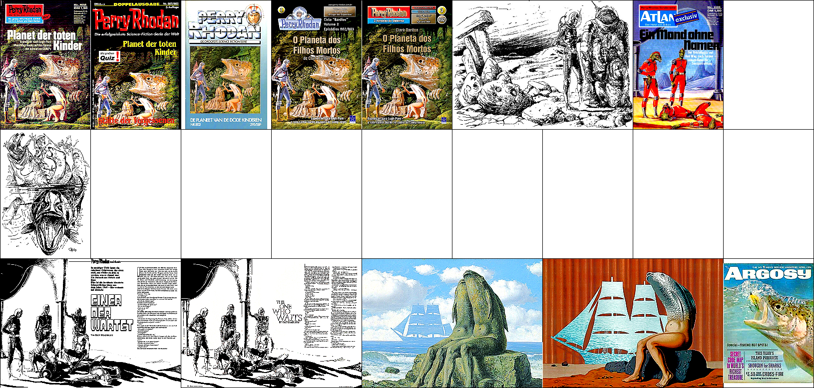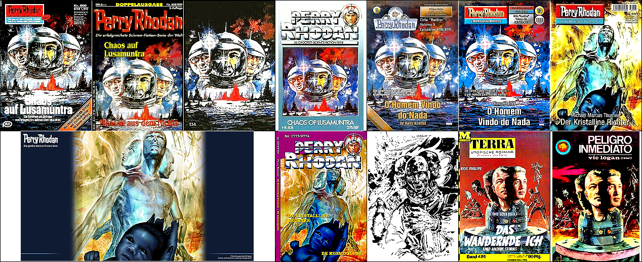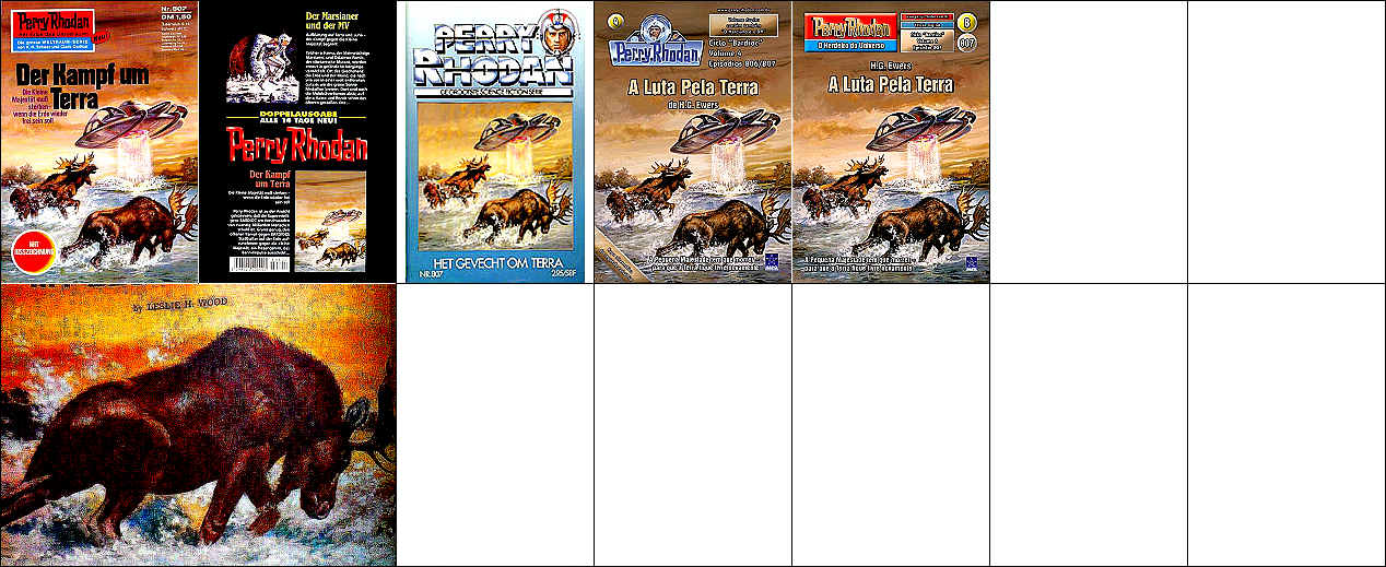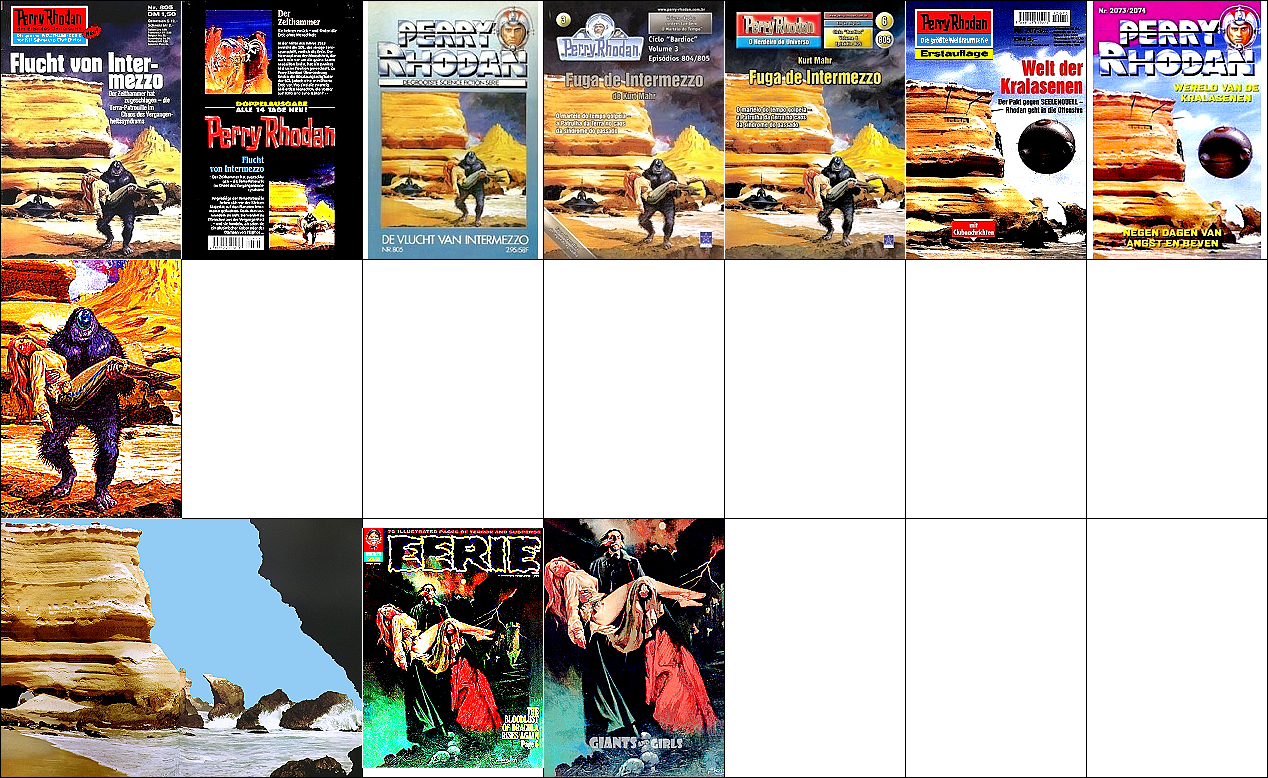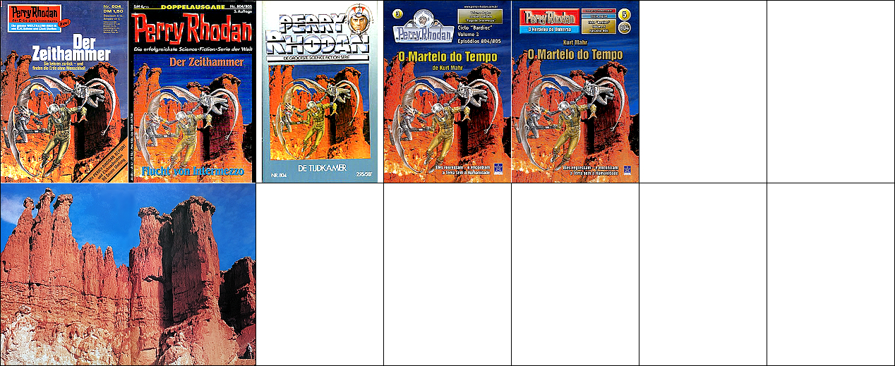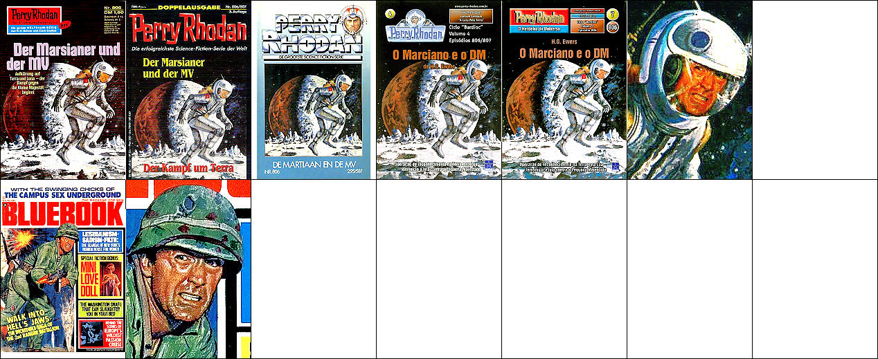 1 - 12 gleiches Bild, zum Teil Ausschnitte des doppelseitigen Titelbildes, 13 - 16 gleiches Bild, hier findet sich die Doppelsonne wieder, 22 Vorbild für Doppelsonne, 23 für die Galaxisspirale und den Ringplaneten am Himmel, 24 für das kleine Raumschiff mit dem kugelförmigen Abgasstrahl, das Kugelraumschiff in 1 hat sein Original in 25 (man beachte die Nr. 14 auf der Hülle und den aus dem Hangar ausfliegenden Jäger), der fliegende Raumfahrer stammt von 26, die Funkantenne unter dem Raumfahrer hat ihr Vorbild in dem Gebilde auf dem Bildschirm in 27 |