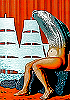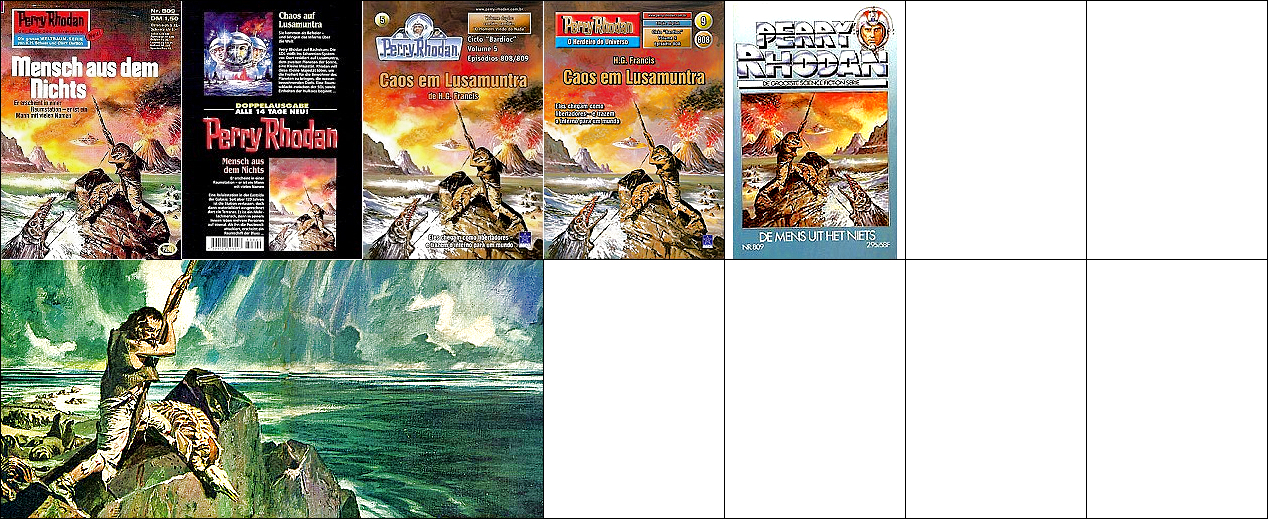 1 - 5 gleiches Bild, 5 seitenverkehrt, das Motiv ist von 8 gespiegelt eingeklebt (man beachte auch das zu Füßen des Menschen liegende Fischgerippe und den Felsblock) und der Mensch in einen Außerirdischen verwandelt |