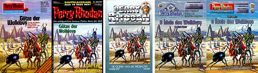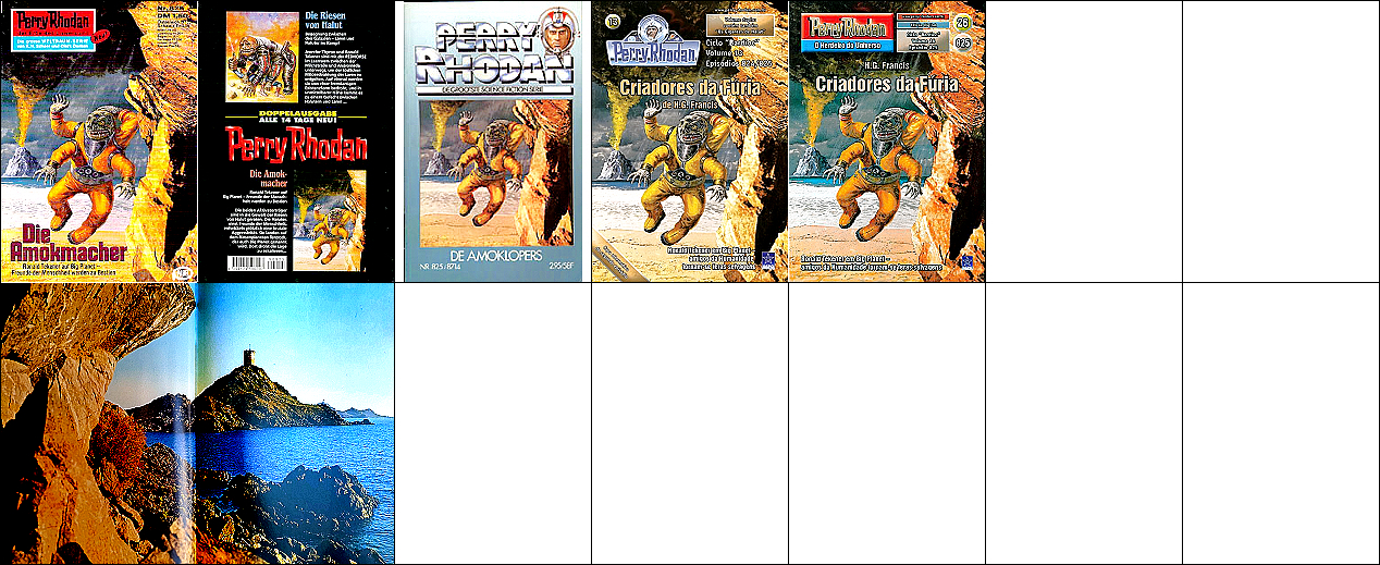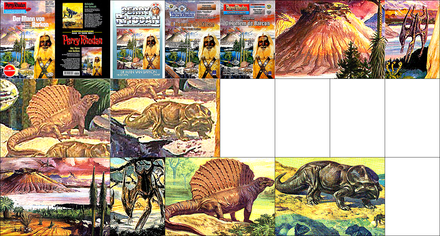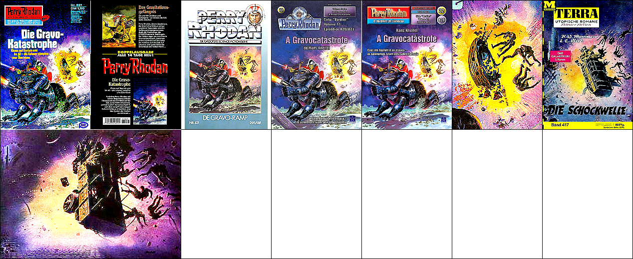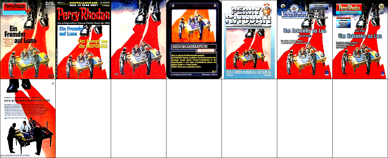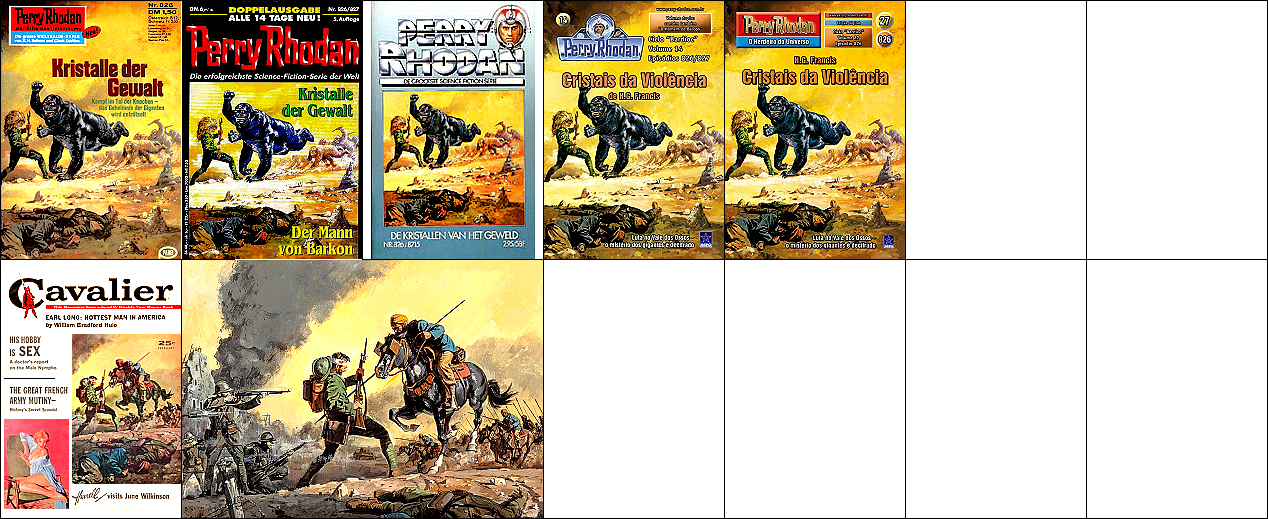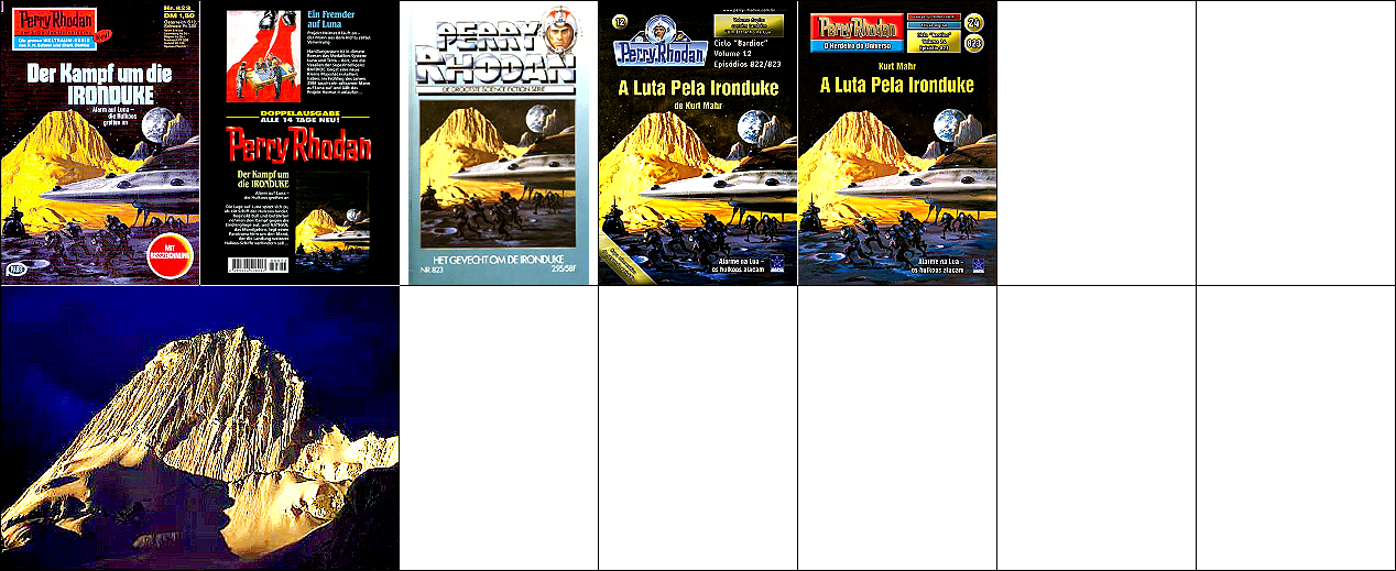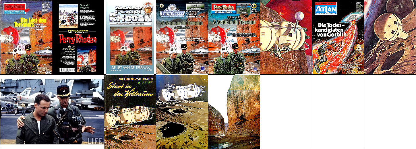 1 - 5 gleiches Bild, die Soldaten sind von 8 als Collage eingebaut und mit Raumhelmen ergänzt, das Raumschiff am linken Bildrand ist von 9 bzw. 10 übernommen, das kugelförmige Endteil des Raumschiffes, das in 1 nicht zu sehen ist, wurde in 7 eingebaut, 9 - 10 gleiches Bild, der Felsen am rechten Rand ist von 11 übernommen und zeigt eine Szene in der Schlucht von Seldscha bei Methaoui, Tunesien |