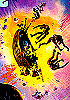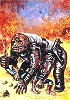 laufender Haluter, auf dessen Rücken ein Mensch sitzt, dahinter ein explodiierter Schweber, von dem Menschen weggeschleudert werden, siehe auch