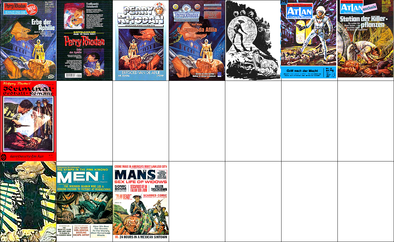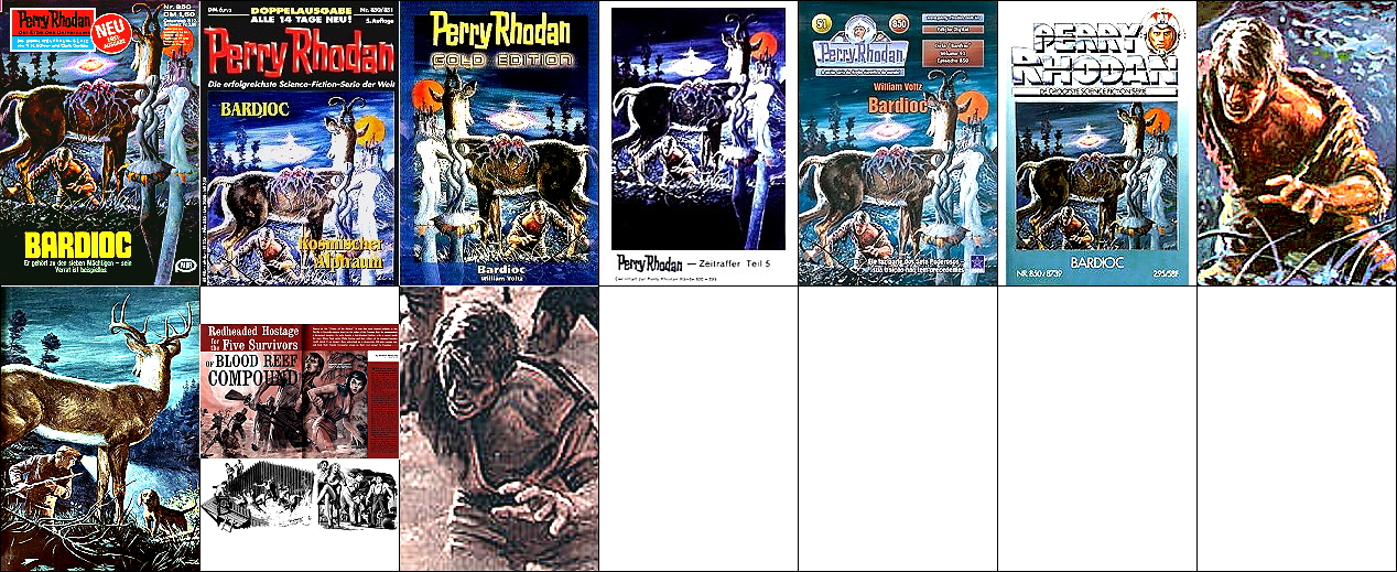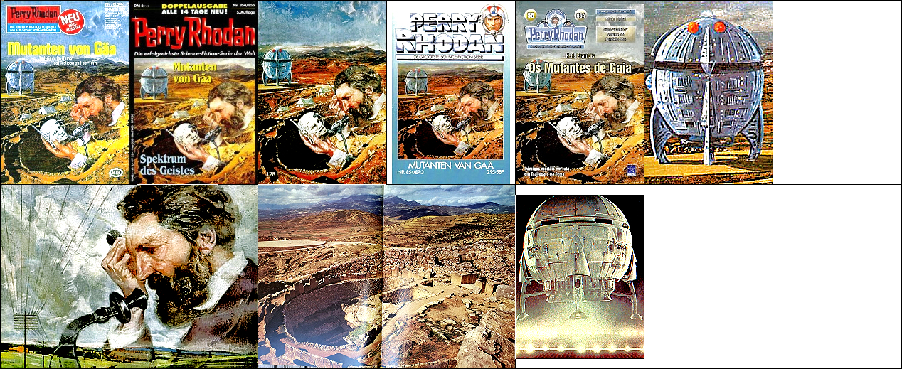 1 - 6 gleiches Bild, die Mondoberfläche mit Krater ist möglicherweise von 8 inspiriert, die Raumstationsteile sind von 9 - 11 nachgezeichnet bzw. übernommen |