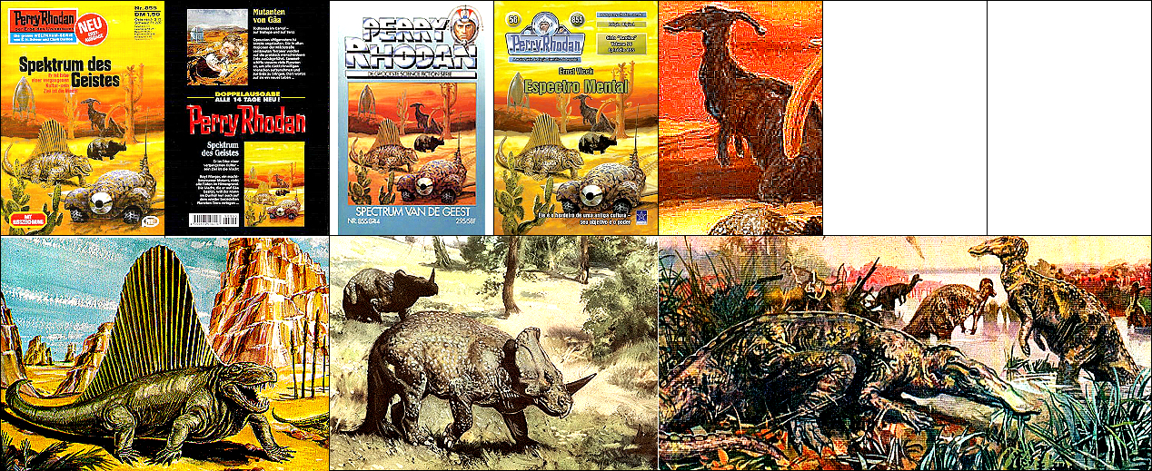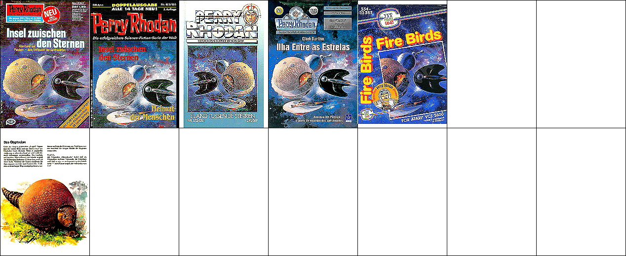 1 - 5 gleiches Bild, 3 seitenverkehrt, die wabenartige Struktur der Raumschiffshülle ist möglicherweise vom Glyptodon in 8 inspiriert |