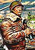 Mann mit Stahlhelm vor Panzer, dahinter Raketenraumschiff |