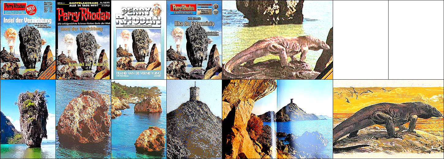 1 - 4 gleiches Bild, der eigenartige Felsen in der Mitte ist der "James-Bond-Felsen" in Khao Ta-Pu, Phanga-Bucht/Thailand, der Felsen links stammt aus der Küste bei Brela Donja, Dalmatien, der Leuchtturm im Hintergrund links von den Iles Sanguinaires bei Korsika, der Komodo-Waran ist aus 11 entnommen |