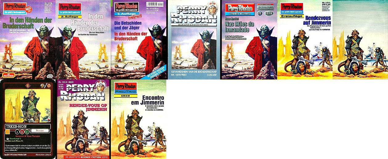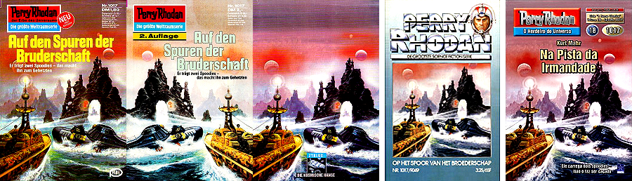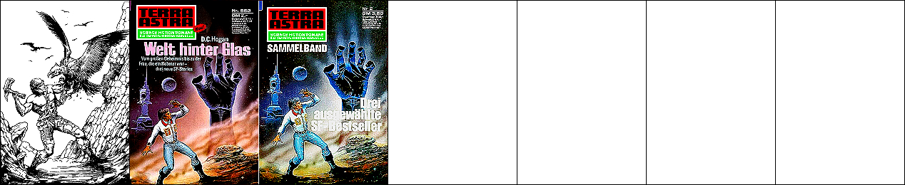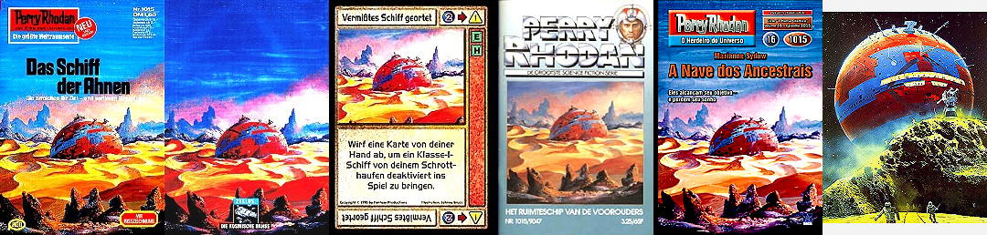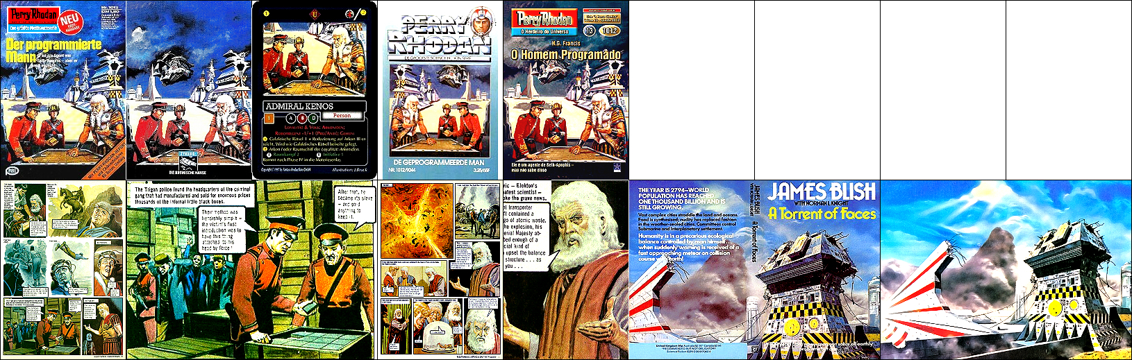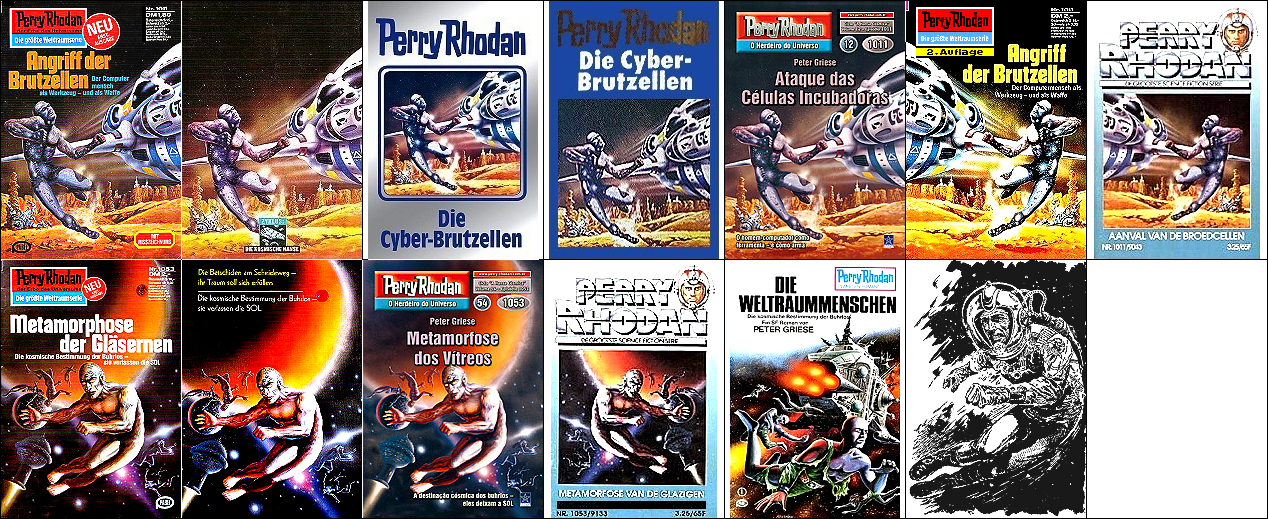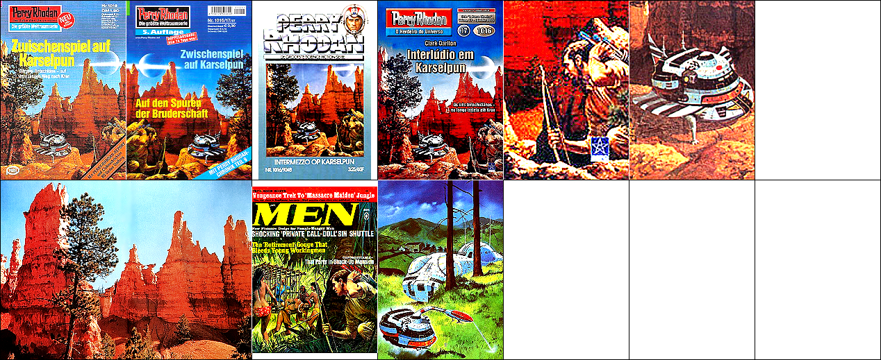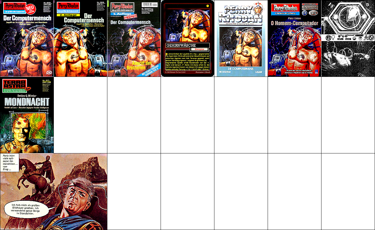 ähnliches Motiv, 1 - 7 gleiches Bild, 6 - 7 seitenverkehrt, 8 - 11 gleiches Bild, 11 seitenverkehrt, Perry Rhodan in 13 hat die gleiche Körperhaltung wie der Weltraummensch in 8 |