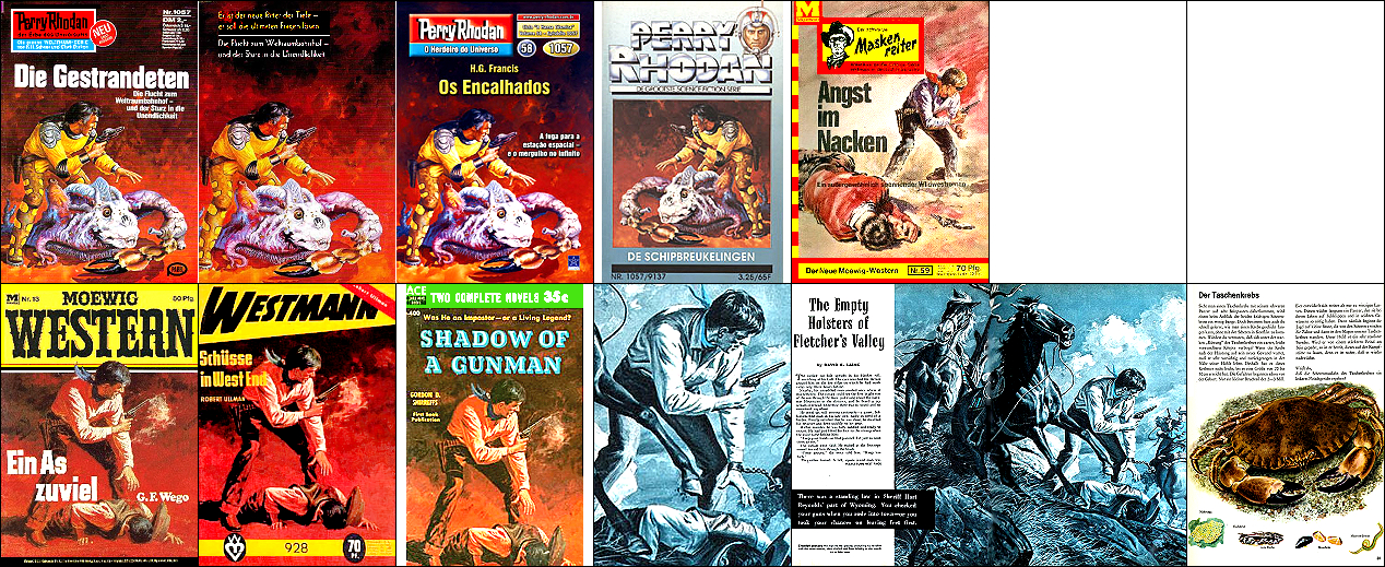 1 - 4 gleiches Bild, 4 seitenverkehrt, in 5 hat der Mann eine sehr ähnliche Körperhaltung und auch den Waffengurt an der Hüfte, 8 - 10 gleiches Bild, zusammen mit 11 mögliche Vorbilder für den Mann, die Krebsschere in 1 ist von 12 entnommen |