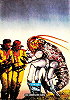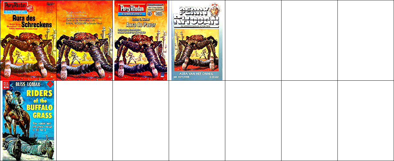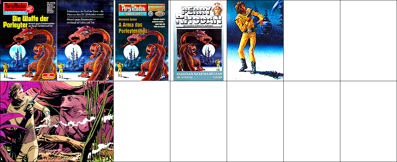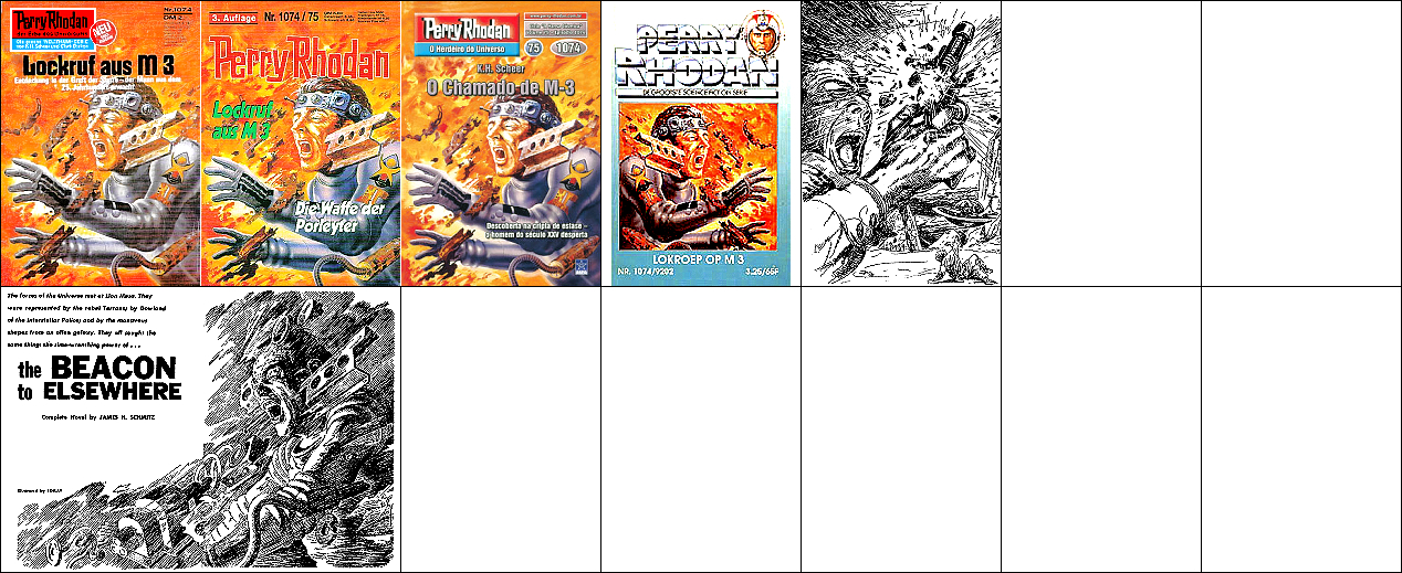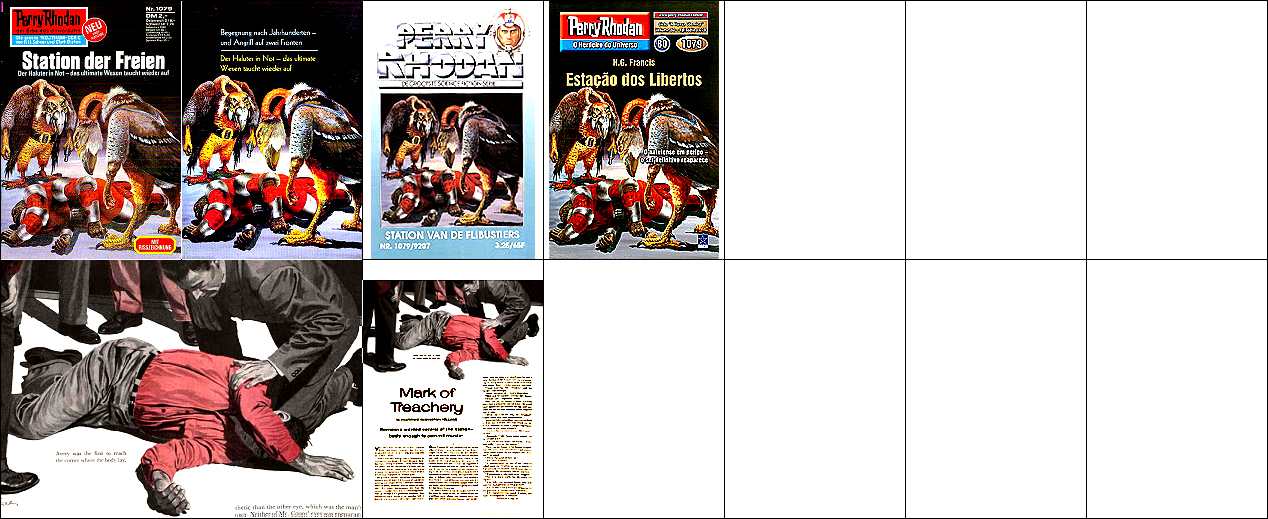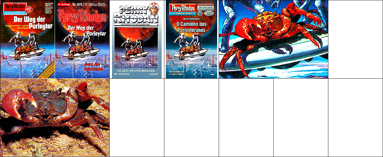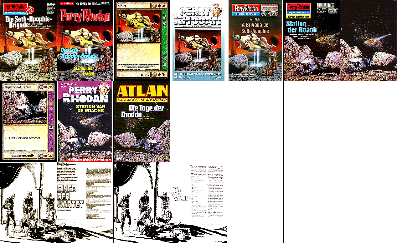 1 - 5, 6 - 10 gleiches Bild, 10 gespiegelt und ohne Raumboot im Hintergrund, der Felsbrocken im Vordergrund taucht in allen Bildern auf, die beiden Männer in 1 könnten von zwei der Figuren in 15 bzw. 16 inspiriert sein |