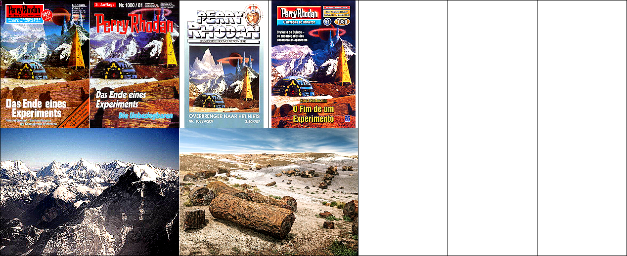 1 - 4 gleiches Bild, beim Bergmassiv im Hintergrund handelt es sich um den Gauri Sankar an der Grenze zwischen Tibet und Nepal, die Szene unten könnte aus dem Nationalpark "Petrified Forest" in Arizona, USA, stammen |