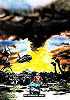 explodierende fliegende Stadt zwischen Felsbrocken |