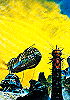 Raumfahrer vor Raumboot und Fremdwesen mit Schlangenhälsen |