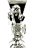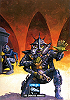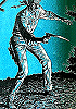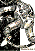 Mann in Ritterrüstung kniet auf einem Bein und hebt seine achtfingrige Hand, siehe auch
