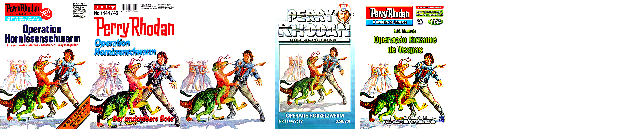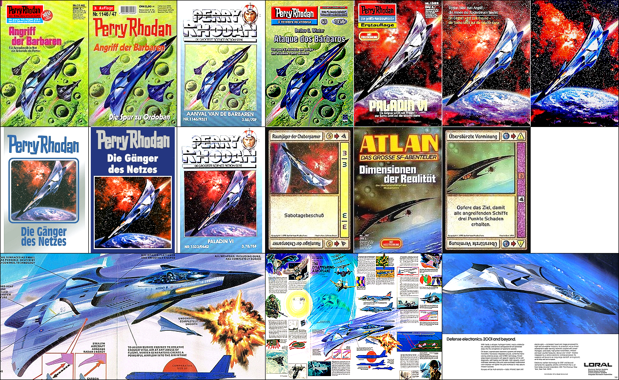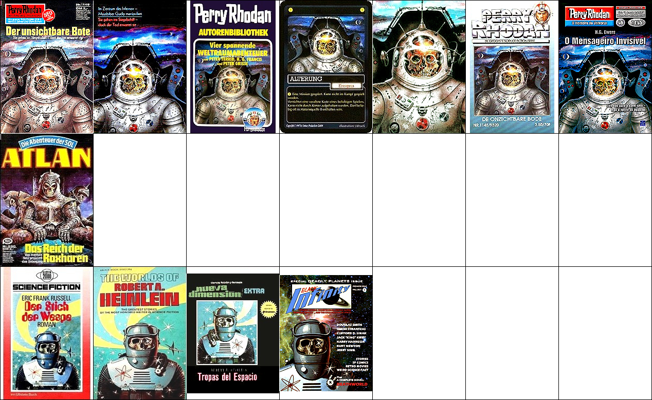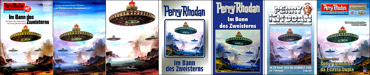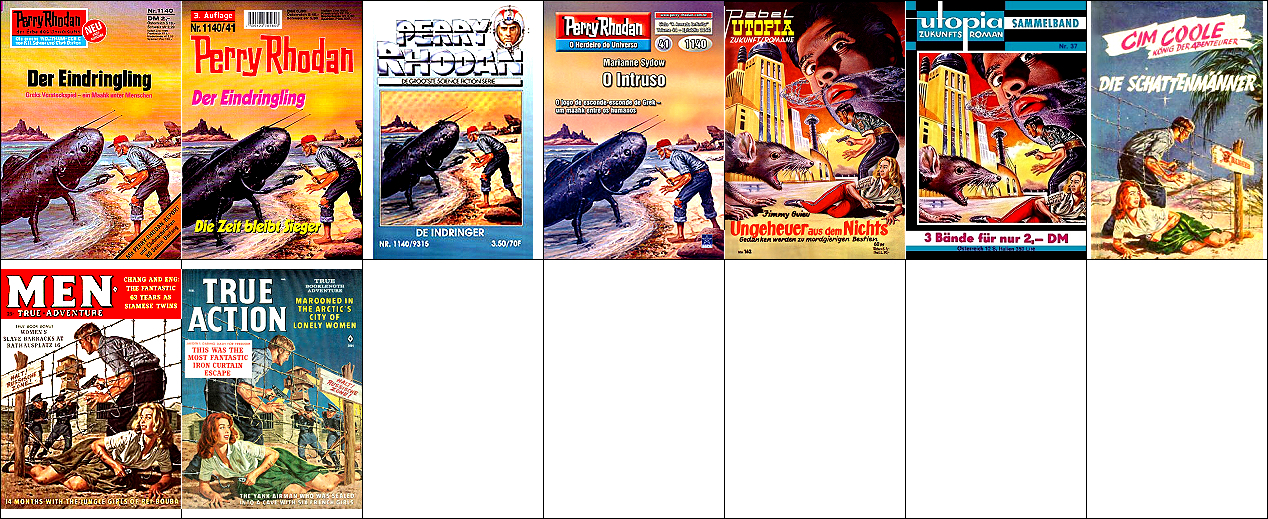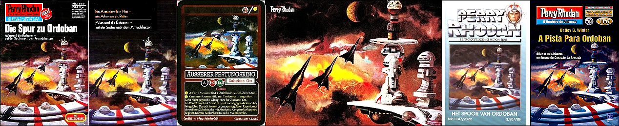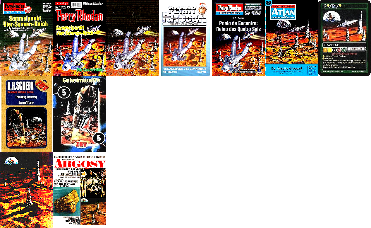 Mond mit Felsnadeln und Planet sehr ähnlich, 1 - 5, 6 - 7 gleiches Bild, 8 - 9 gleiches Bild, seitenverkehrt. Bei 8 bzw. 9 dürfte die Vorlage von Bruck mit einem anderen Raumschiff ergänzt worden sein. 15 bzw. 16 ist die Vorlage für den Mondhintergrund mit den Felsnadeln und der Erde am Horizont. |