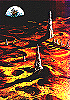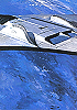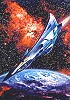 Raumfahrer bzw. Space Jet bzw. Walzenraumschiff fliegt über Mond mit Felsnadeln, am Horizont blauer Planet |