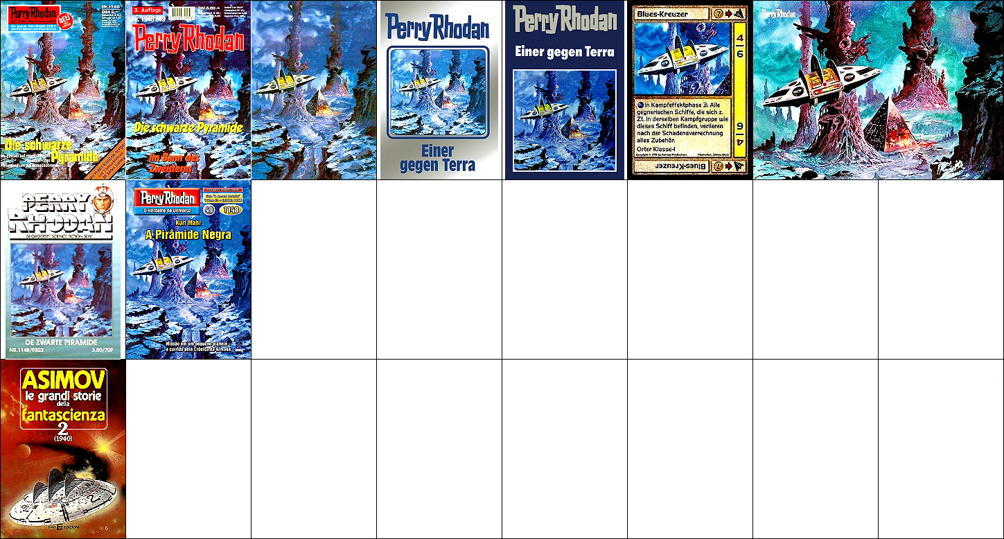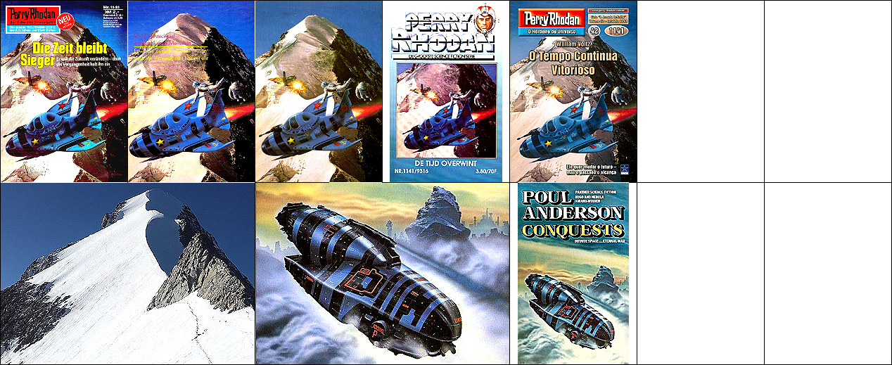 1 - 5 gleiches Bild, das Bergmassiv im Hintergrund zeigt den Piz Bernina in der Schweiz über den Biancograt, das Raumboot in 9 bzw. 10 könnte Inspiration für das Boot in 1 sein (man bachte vor allem die blauschwarze Farbe) |